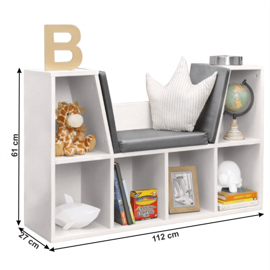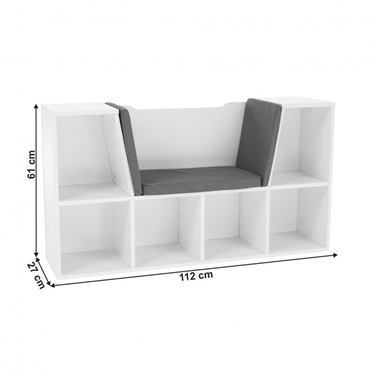 Materiál konstrukce: DTD laminovaná Barva konstrukce: bílá Materiál polštář: látka Barva polštář: šedá Rozměry (ŠxHxV): 112x27x61 cm tři polštáře šest polic S místem k sezení Nosnost místa k sezení: 50 kg Do dětského pokoje Do školky, klubovny Dodávané v demontu