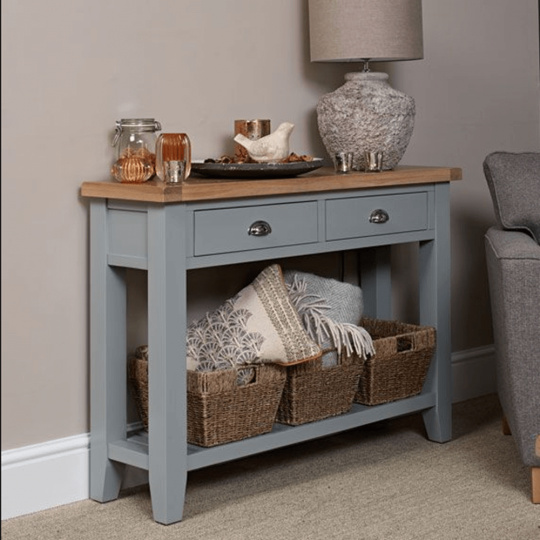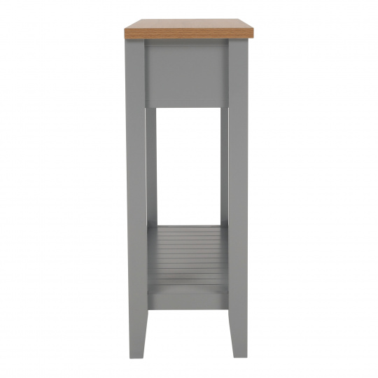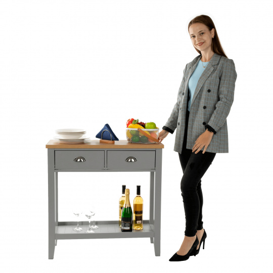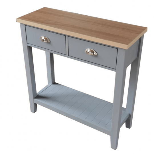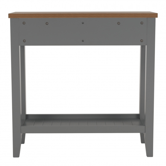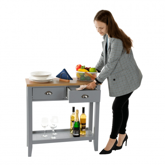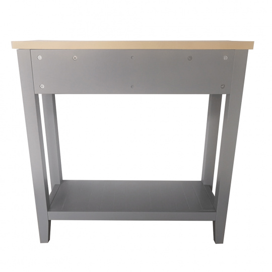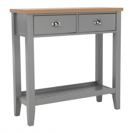 Materiál: MDF / DTD laminovaná Tloušťka materiálu: 25 mm Barva: šedá / světlý ořech Rozměry (ŠxHxV): 80x30x80 cm dva šuplíky S policí konzola konzolový stolek Dodávané v demontu.
