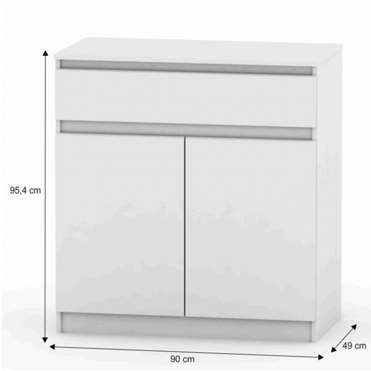 2 dveřová komoda s jedním šuplíkem HANY NEW 007 Materiál: DTD laminovaná Barva: bílá Rozměry (ŠxHxV): 90x49x95,4 cm Tloušťka materiálu: 16 mm ABS hrany Kvalitní slovenský výrobek. Dodávané v demontu.