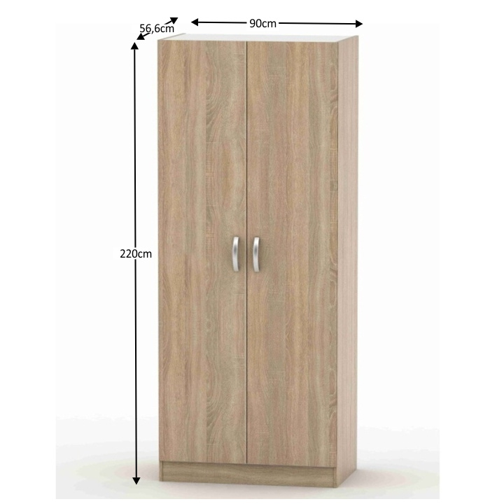 2-dveřová skříň, věšáková, poličková, BETTY 2 Materiál: DTD laminovaná Barva: dub sonoma Rozměry (ŠxHxV): 90x56,6x220 cm Dodávané v demontu. Hmotnost: 90.8kg