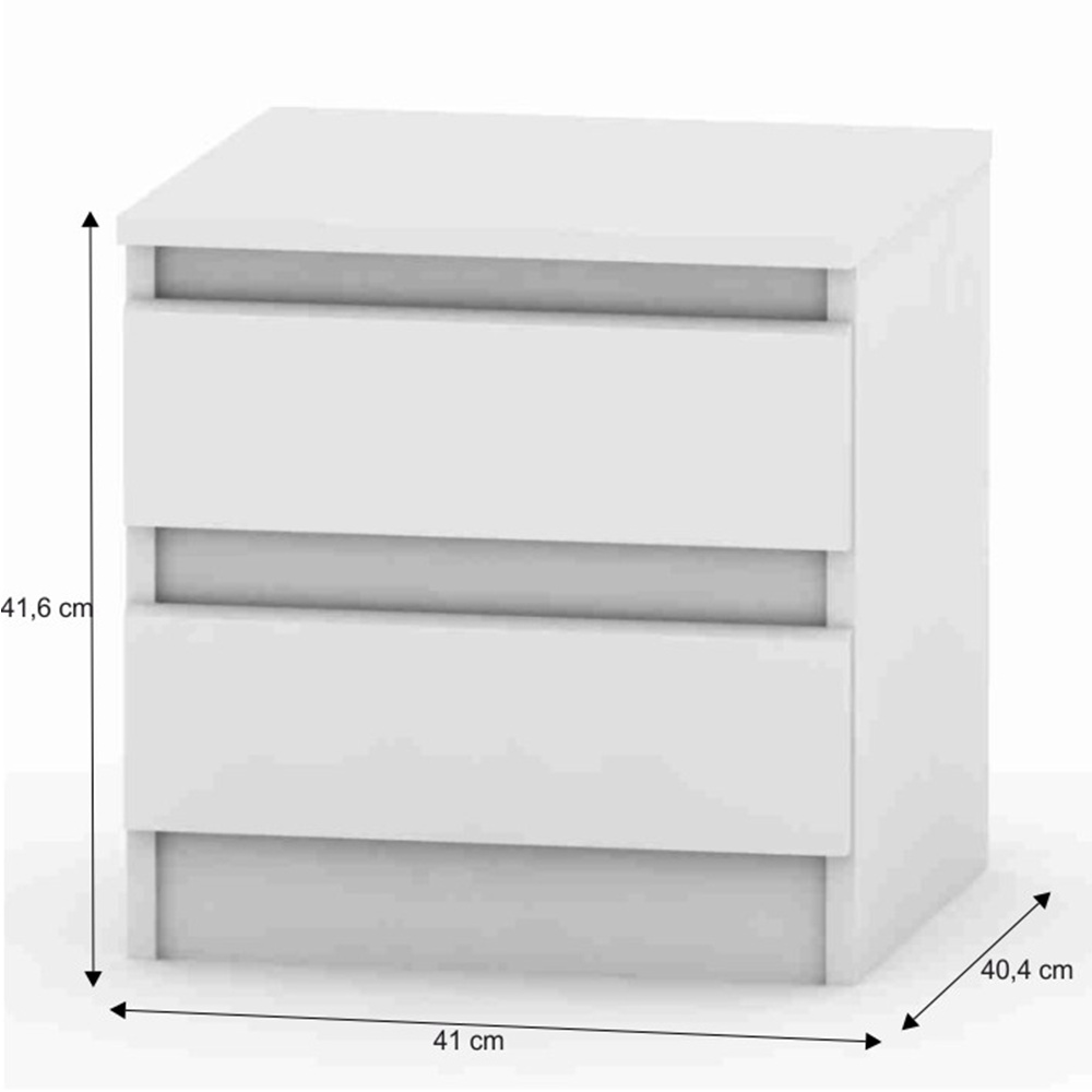 2 šuplíkový noční stolek HANY NEW 002 Materiál: DTD laminovaná Barva: bílá Rozměry (ŠxHxV): 41x40,4x41,6 cm Tloušťka materiálu: 16 mm ABS hrany Kvalitní slovenský výrobek. Dodávané v demontu.