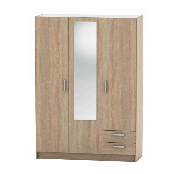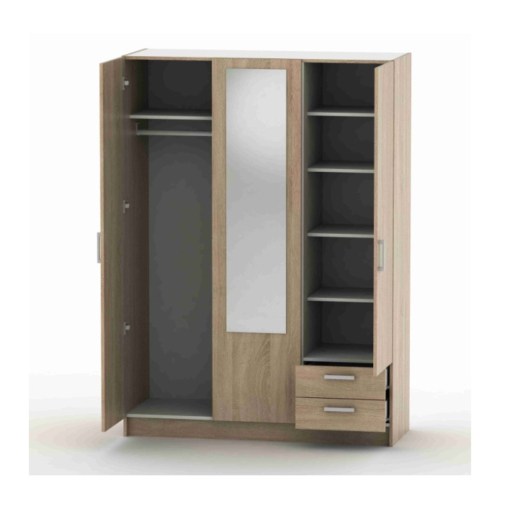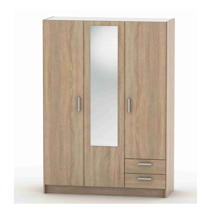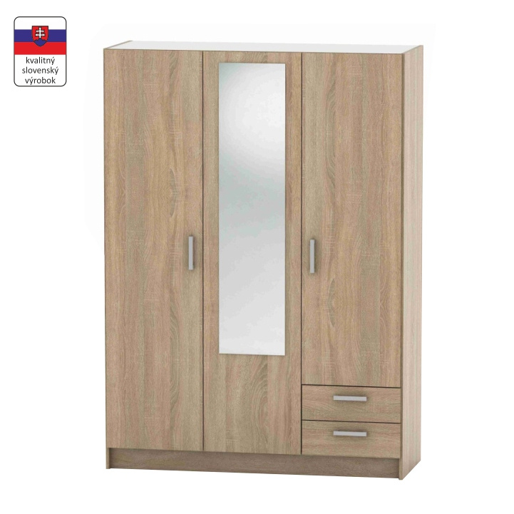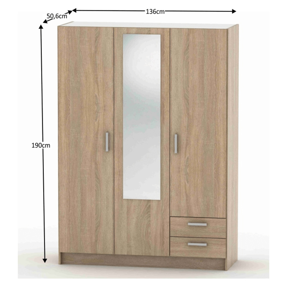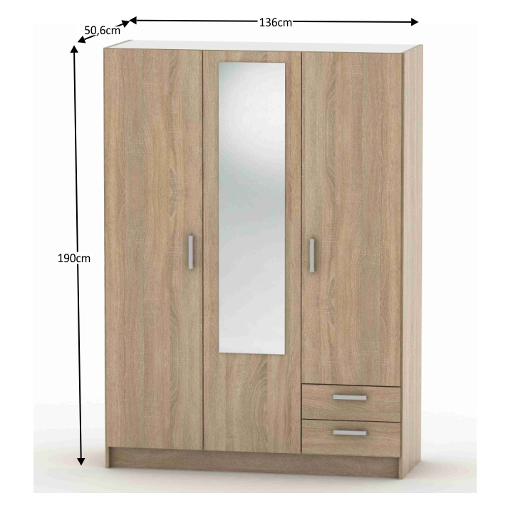 3-dveřová skříň, s šuplíky a zrcadlem BETTY 7 Materiál: DTD laminovaná Barva: dub sonoma Rozměry (ŠxHxV): 136x50,6x190 cm Tloušťka materiálu korpus: 16 mm Dodávané v demontu.
