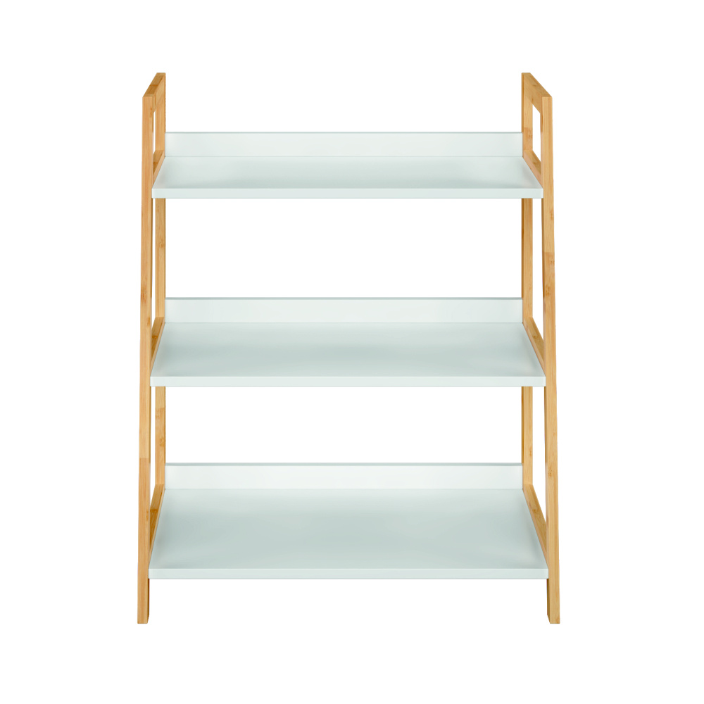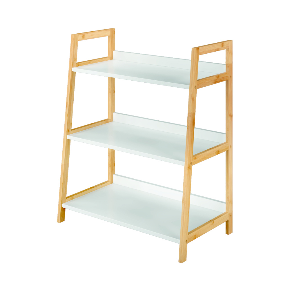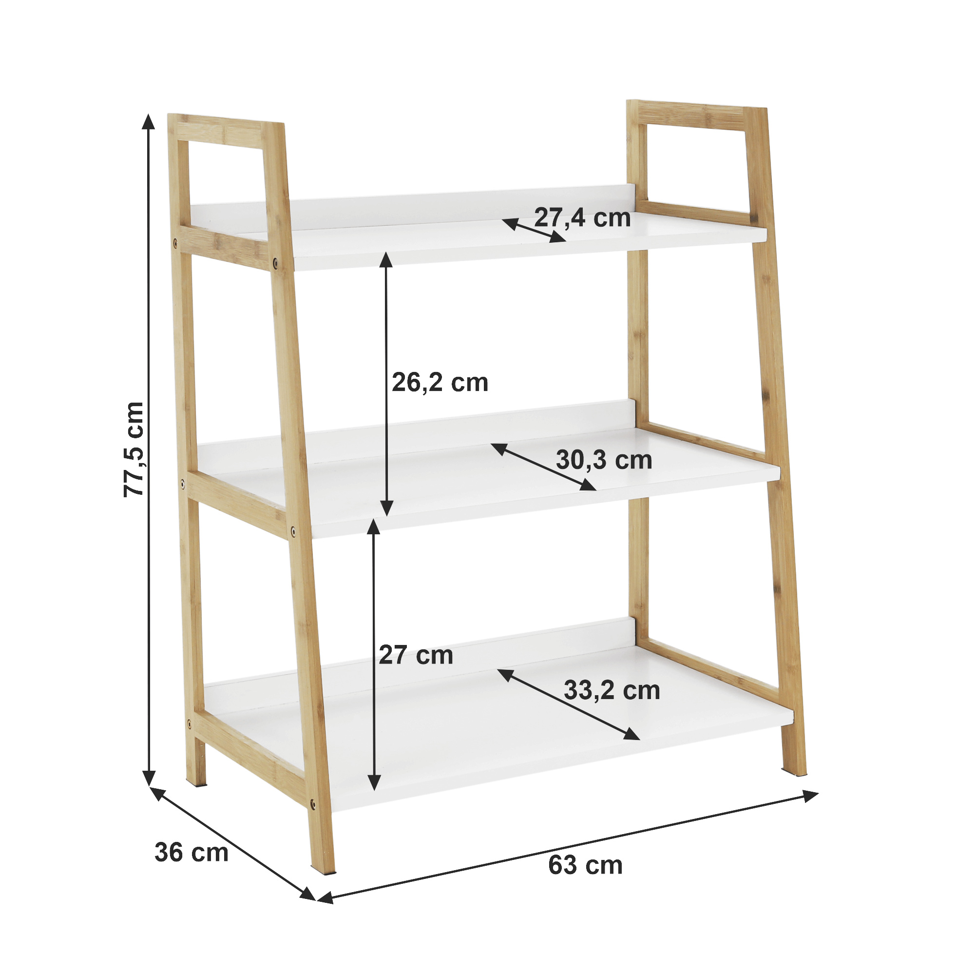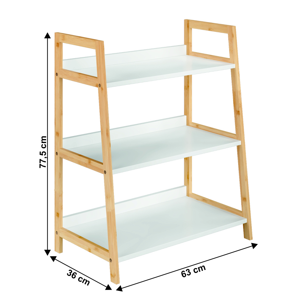 Víceúčelový regál Koen TYP 1 Materiál: MDF / bambus lakovaný Barva: bílá / přírodní Rozměry (ŠxHxV): 63x36x77,5 cm Tloušťka materiálu stojan: 1,4 cm Tloušťka materiálu police: 1,6 cm Nosnost na jednu polici: 5 kg 3 police Hloubka vrchní police: 27,4 cm Hloubka střední police: 30,3 cm Hloubka spodní police: 33,2 cm Prostor mezi vrchní a střední policí: 26,2 cm Prostor mezi střední a spodní policí: 27 cm moderní design praktický Dodávané v demontu.