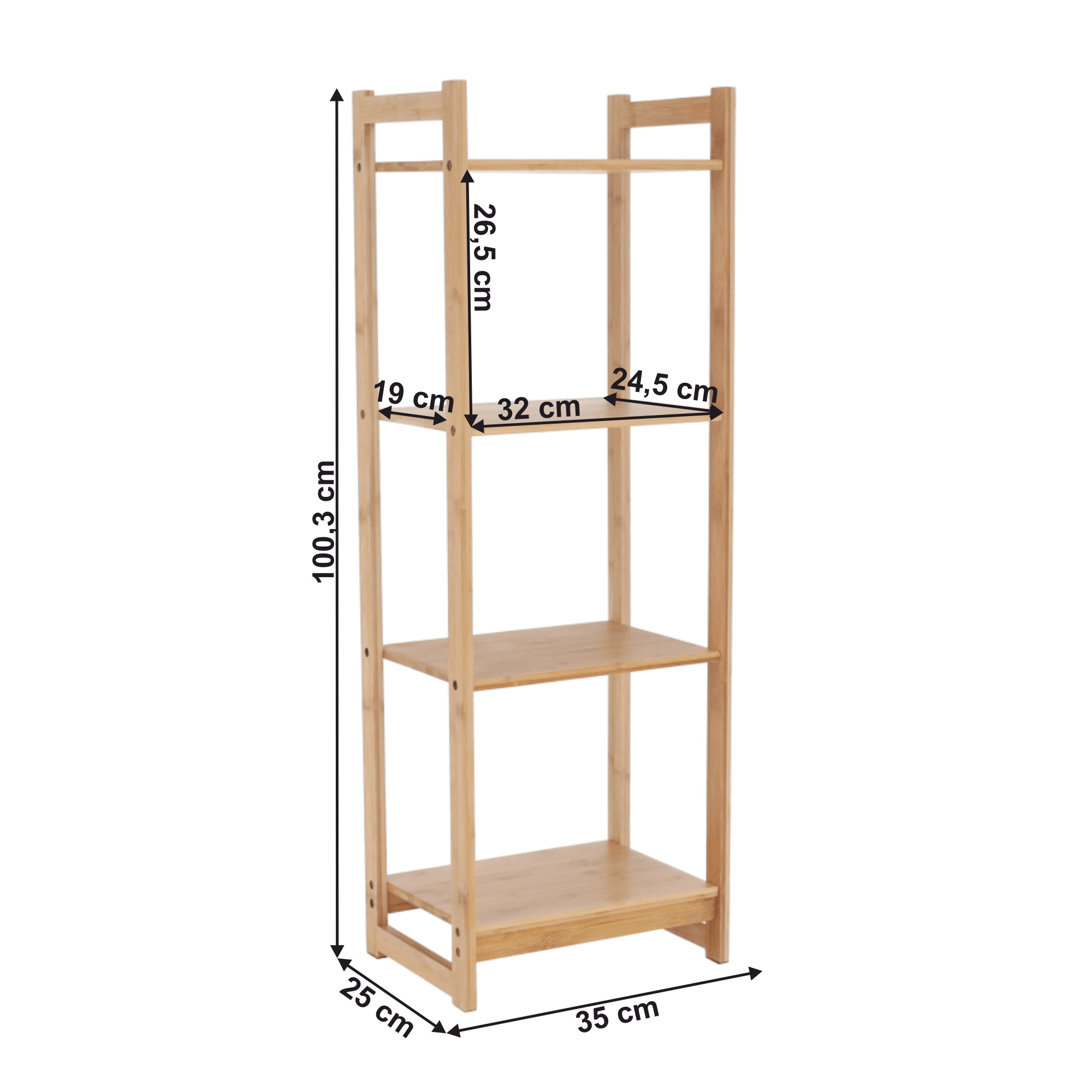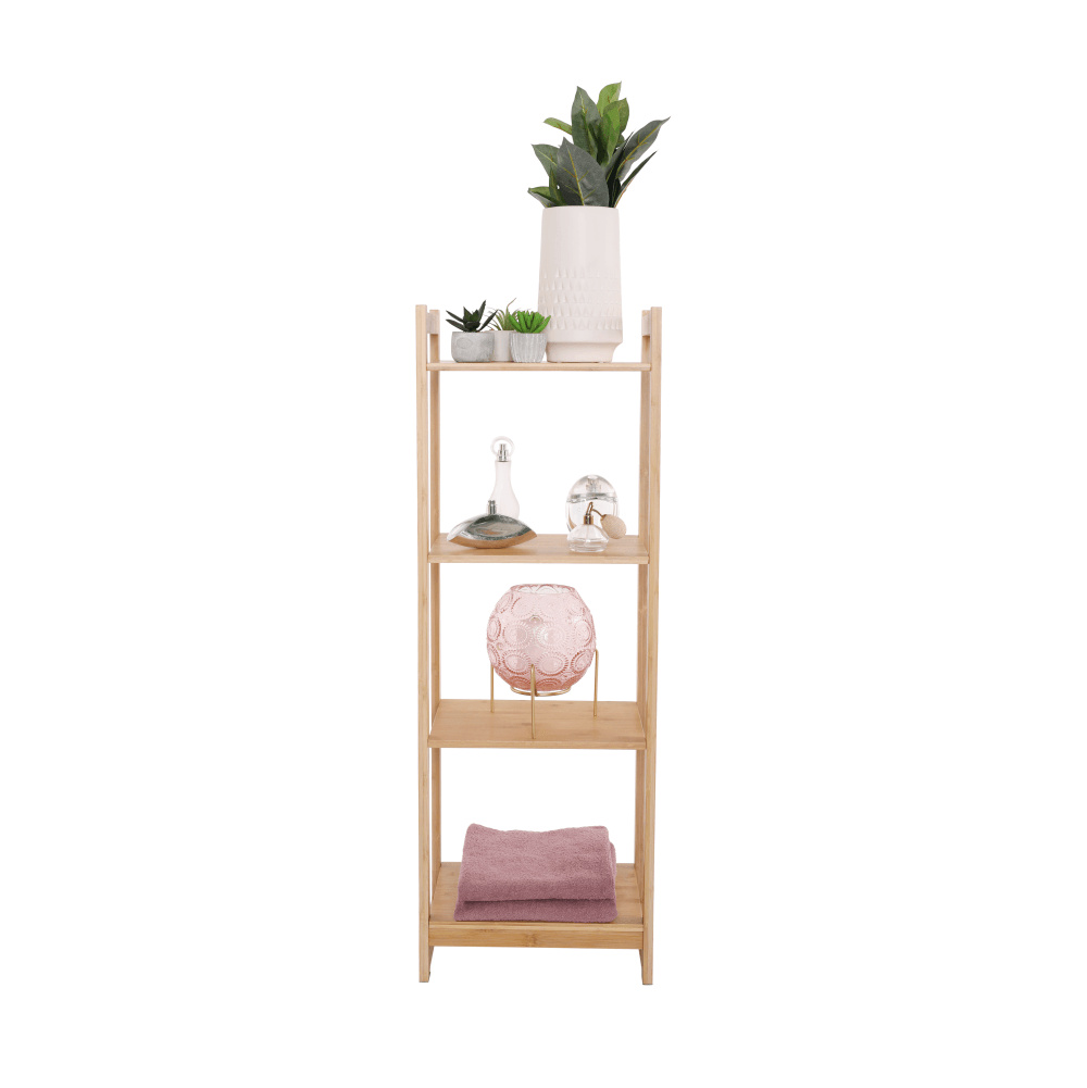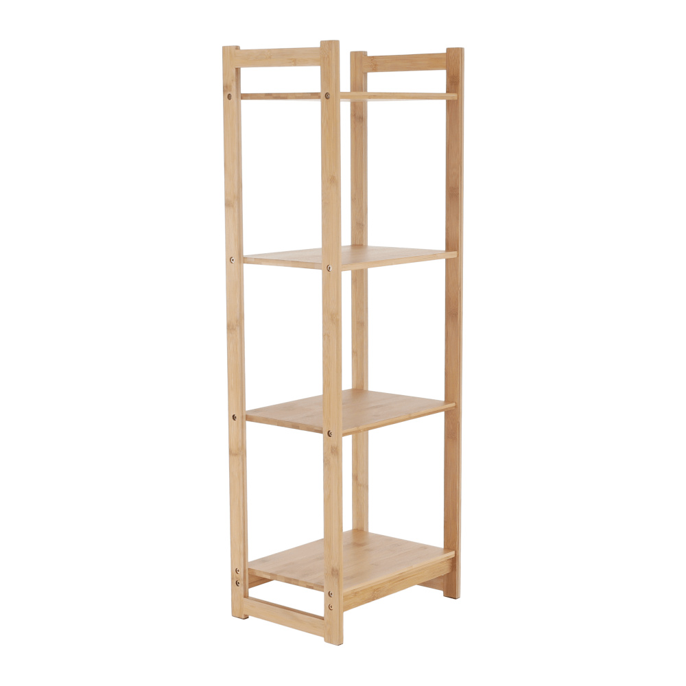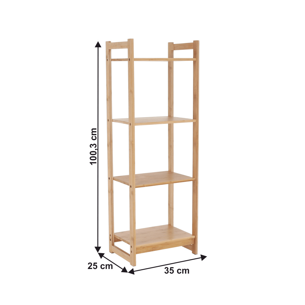 Materiál: lakovaný bambus Barva: přírodní Rozměr (ŠxHxV): 35x25x100,3 cm Vnitřní rozměry poličky (ŠXHxV): 32x19x26,5 cm 4-policový čtyři poličky Víceúčelový Dodávané v demontu