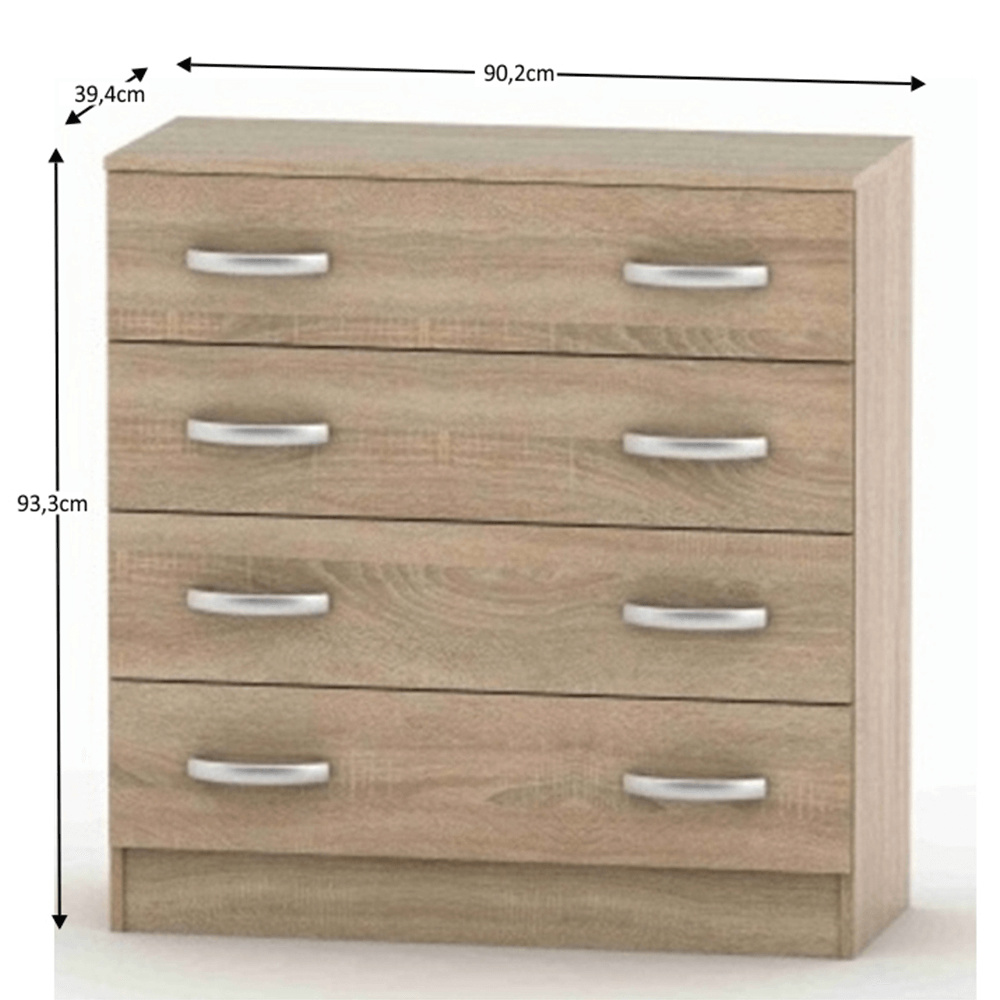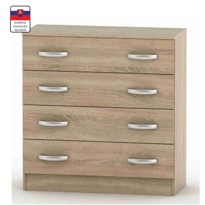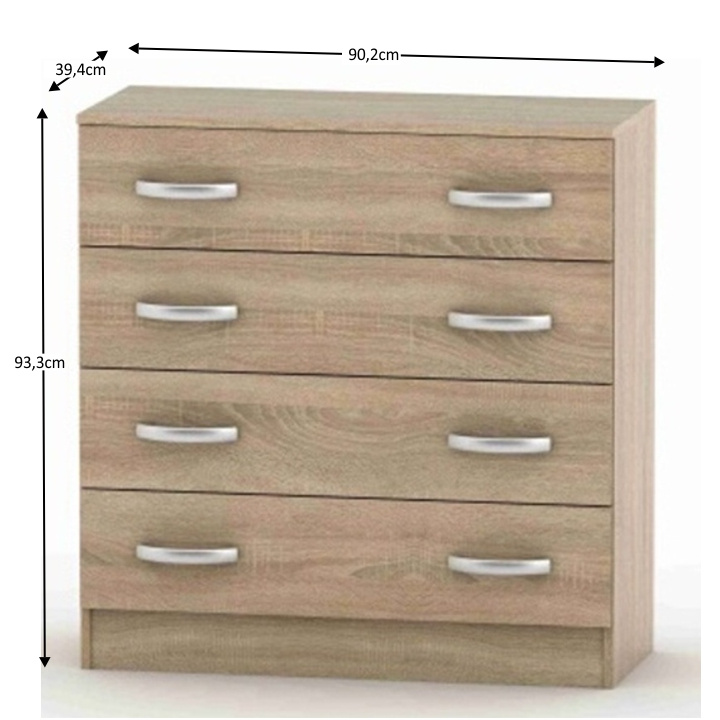 4-šuplíková komoda, BETTY 2 Materiál: DTD laminovaná Barva: Dub sonoma Rozměry (ŠxHxV): 90,2x39,4x93,3 cm Tloušťka materiálu korpus: 16 mm Dodávané v demontu.