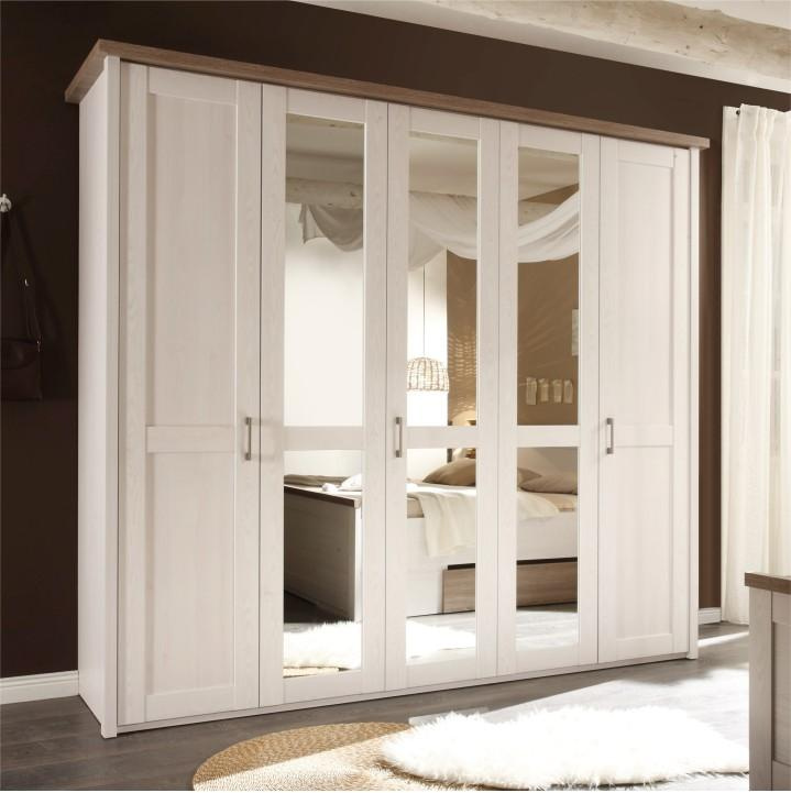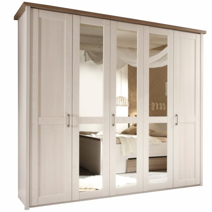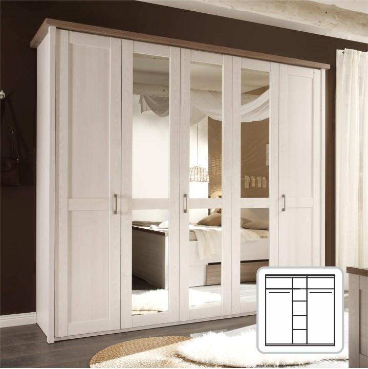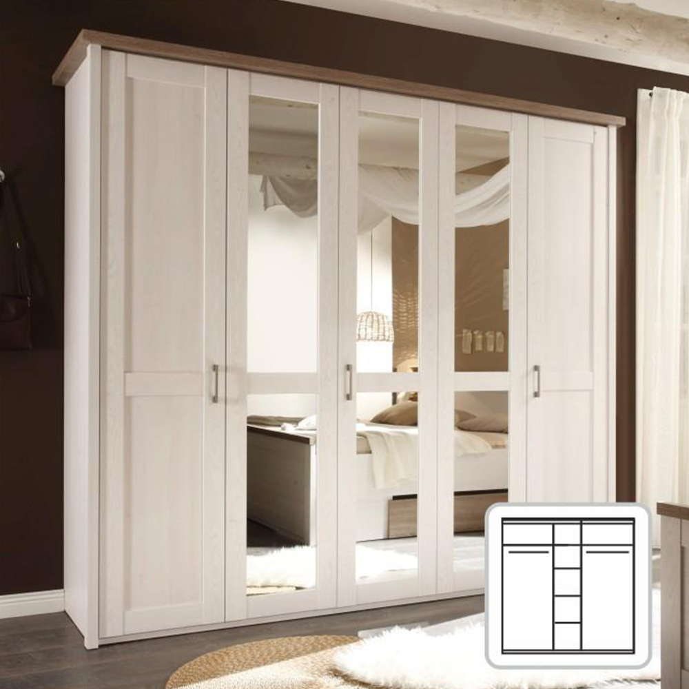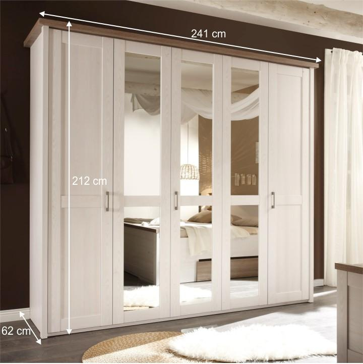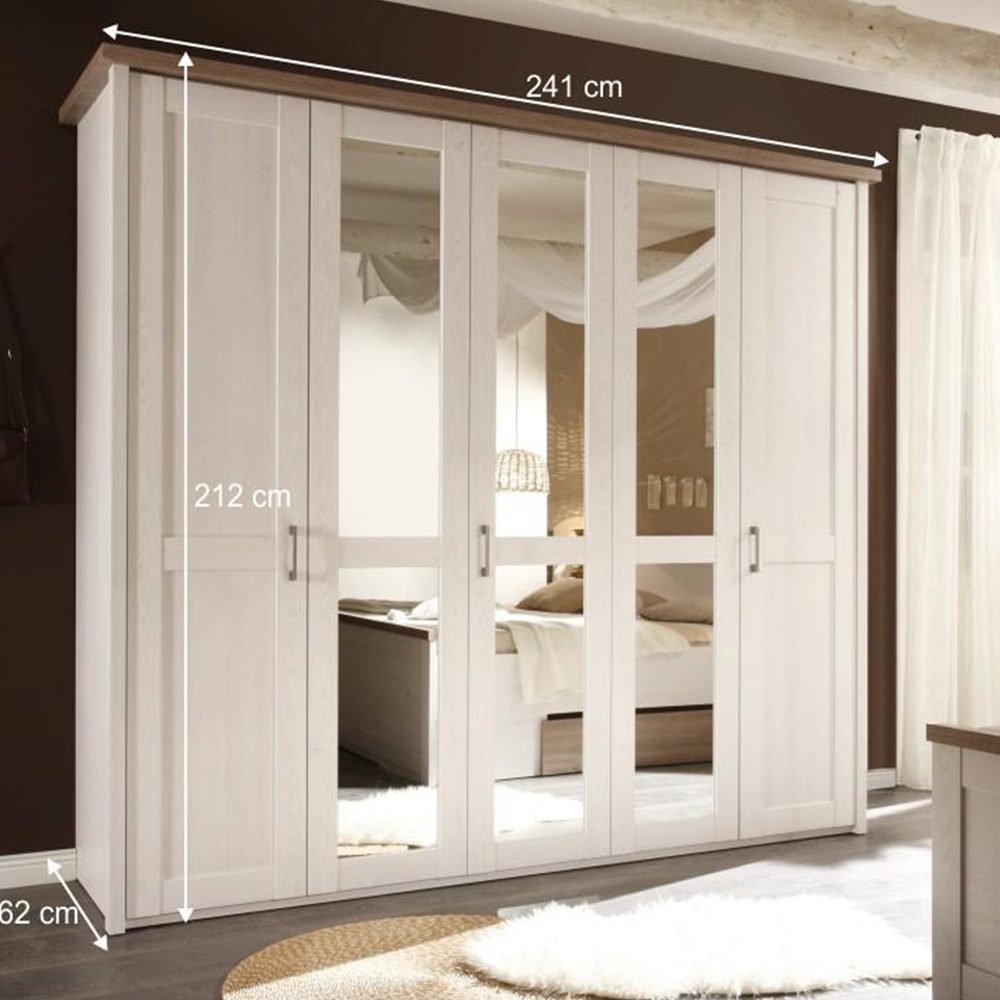 Skříň 5-dveřová se zrcadlem, policová a věšáková část LUMERA. Rozměry (ŠxHxV): 241x62x212 cm Tloušťka materiálu korpus: 16/36 mm Materiál: DTD fóliovaná / zrcadlo Barva: Dub sonoma truflový / Pinia bílá Dodávané v demontu.