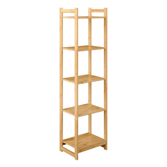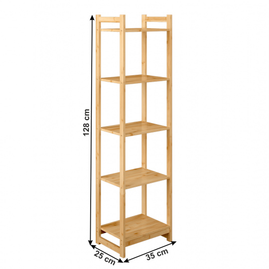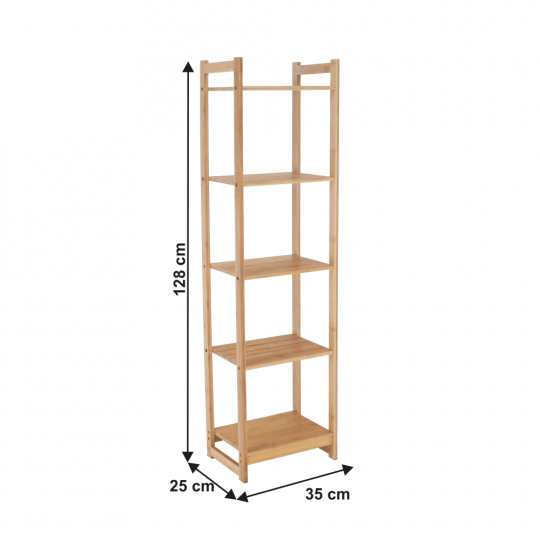 Materiál: lakovaný bambus Barva: přírodní Rozměr (ŠxHxV): 35x25x128 cm Vnitřní rozměry poličky (ŠXHxV): 32x19x26,5 cm 5-policový pět poliček Víceúčelový Dodávané v demontu