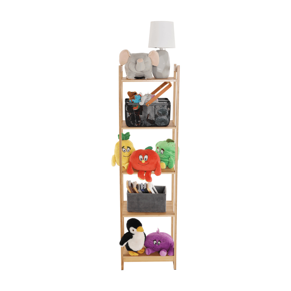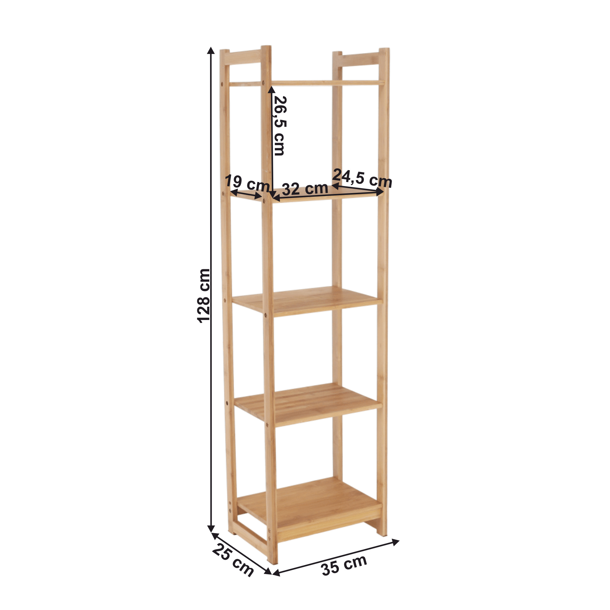Materiál: lakovaný bambus Barva: přírodní Rozměr (ŠxHxV): 35x25x128 cm Vnitřní rozměry poličky (ŠXHxV): 32x19x26,5 cm 5-policový pět poliček Víceúčelový Dodávané v demontu