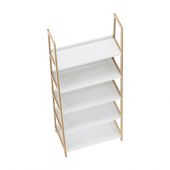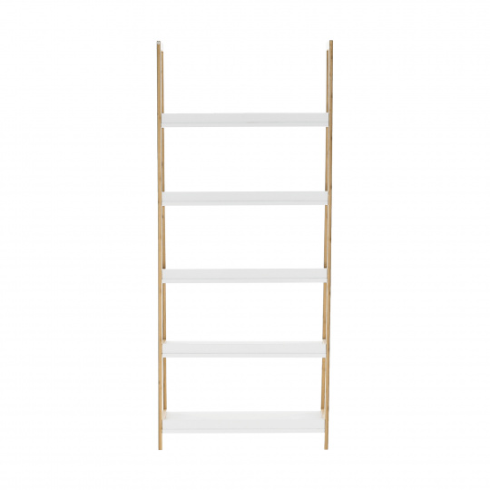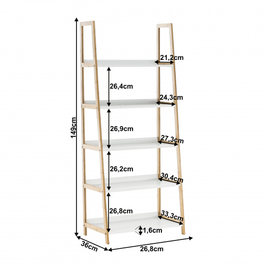 Víceúčelový regál Koen TYP 3 Materiál: MDF / bambus lakovaný Barva: bílá / přírodní Rozměry (ŠxHxV): 63x36x149 cm Tloušťka materiálu stojan: 1,4 cm Tloušťka materiálu police: 1,6 cm Nosnost na jednu polici: 5 kg 5 polic Hloubka vrchní police: 21,2 cm Hloubka 2. police: 24,3 cm Hloubka 3. police: 27,3 cm Hloubka 4. police: 30,4 cm Hloubka spodní police: 33,3 cm Prostor mezi vrchní a 2. policí: 26,4 cm Prostor mezi 2. a 3. policí: 26,9 cm Prostor mezi 3. a 4. policí: 26,2 cm Prostor mezi 4. a spodní policí: 26,8 cm moderní design praktický Dodávané v demontu.