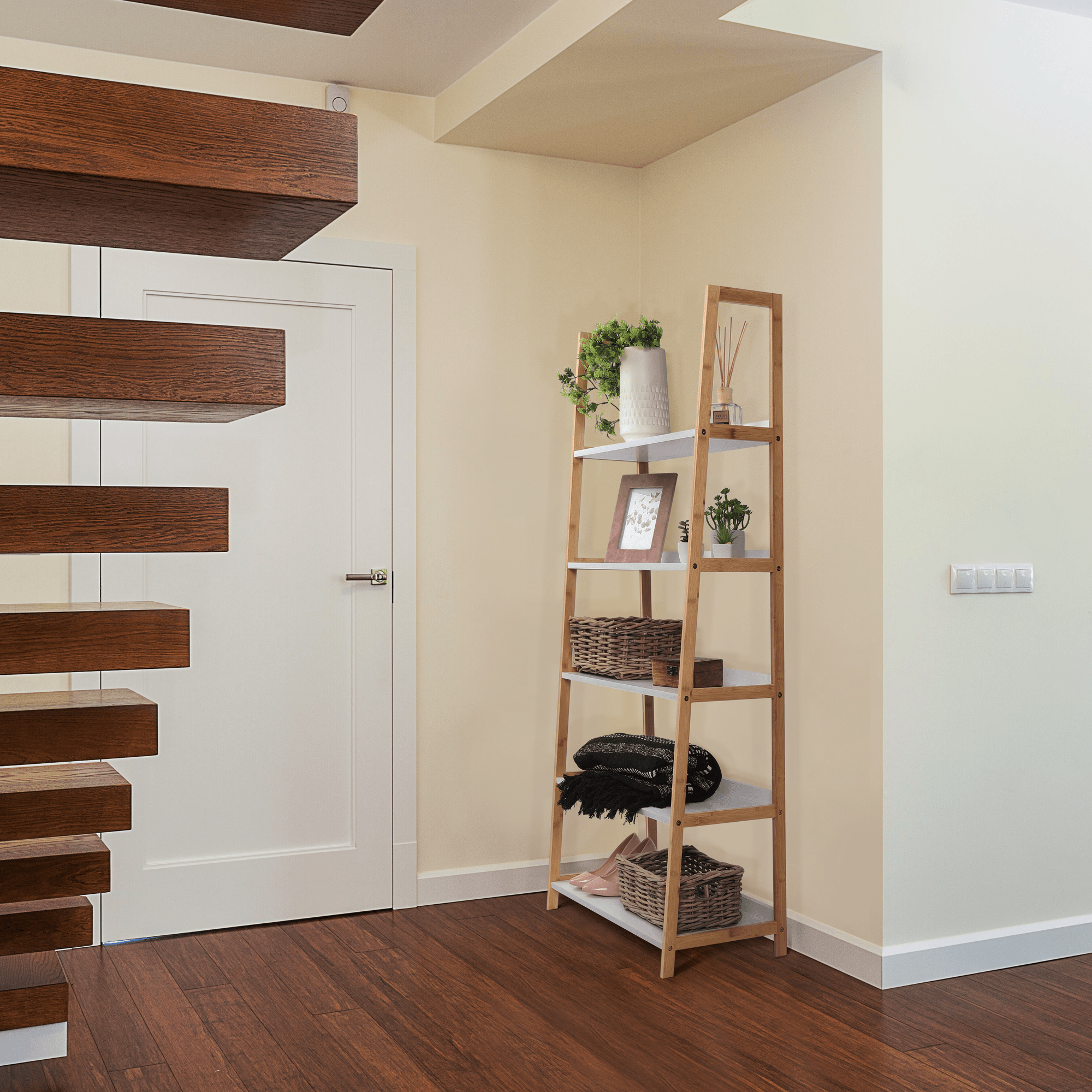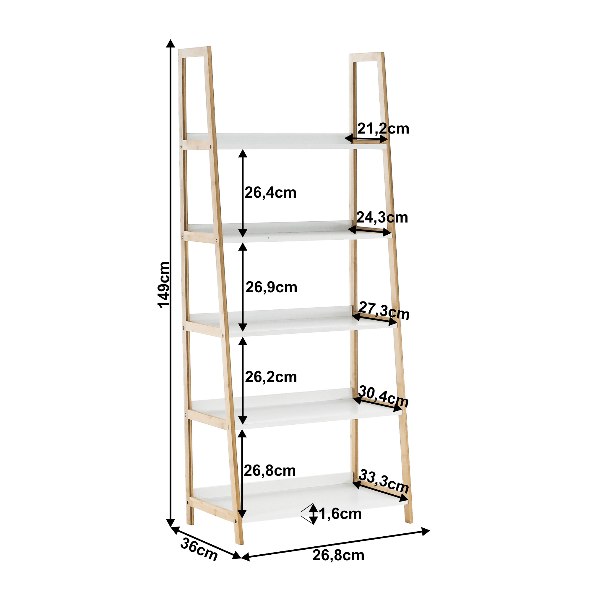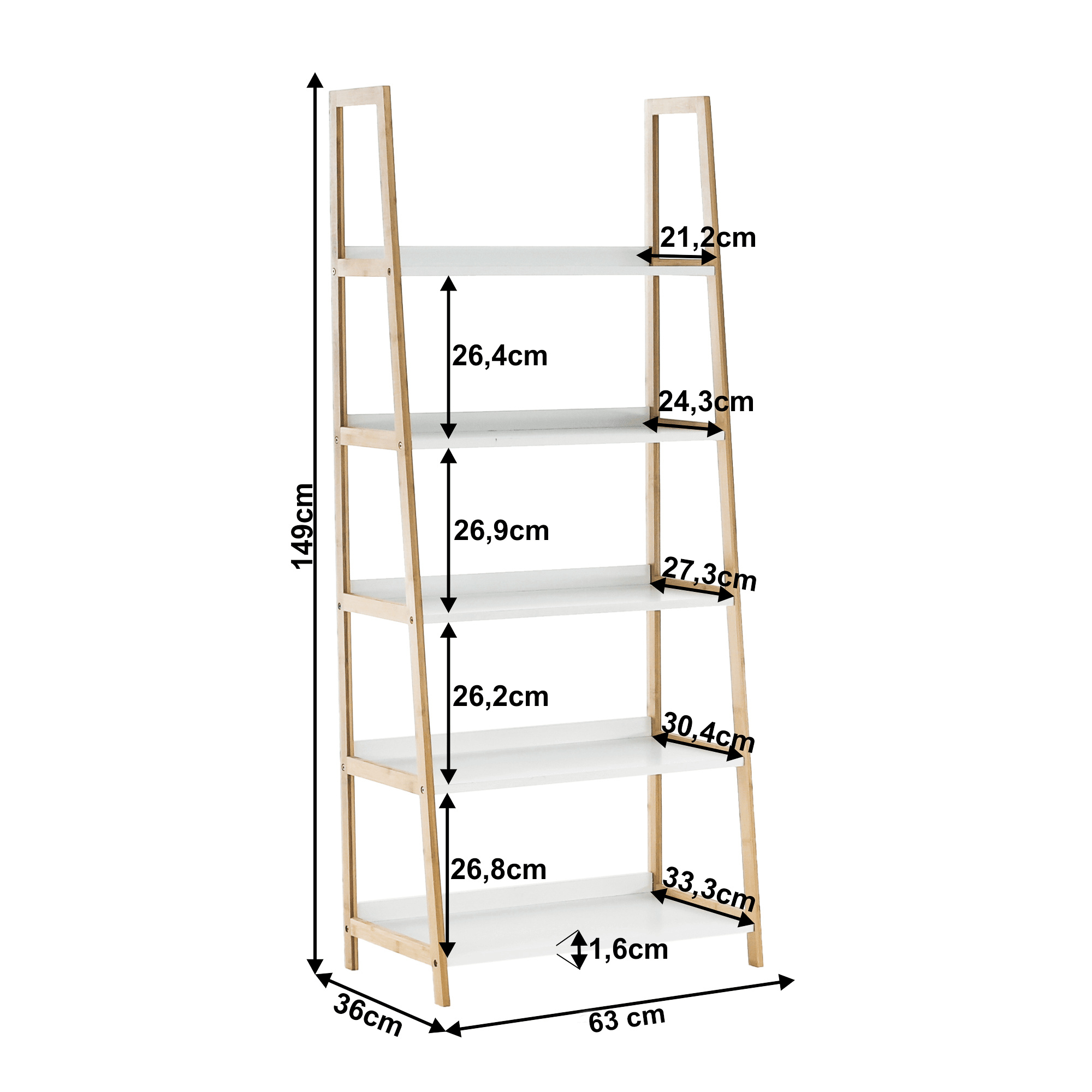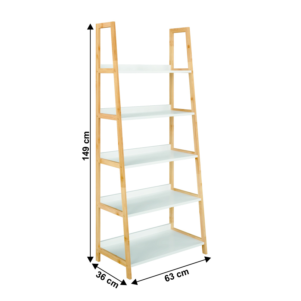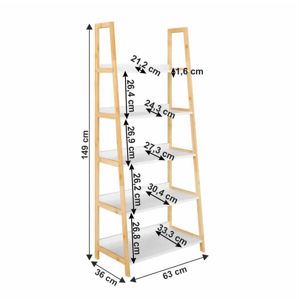 Víceúčelový regál Koen TYP 3 Materiál: MDF / bambus lakovaný Barva: bílá / přírodní Rozměry (ŠxHxV): 63x36x149 cm Tloušťka materiálu stojan: 1,4 cm Tloušťka materiálu police: 1,6 cm Nosnost na jednu polici: 5 kg 5 polic Hloubka vrchní police: 21,2 cm Hloubka 2. police: 24,3 cm Hloubka 3. police: 27,3 cm Hloubka 4. police: 30,4 cm Hloubka spodní police: 33,3 cm Prostor mezi vrchní a 2. policí: 26,4 cm Prostor mezi 2. a 3. policí: 26,9 cm Prostor mezi 3. a 4. policí: 26,2 cm Prostor mezi 4. a spodní policí: 26,8 cm moderní design praktický Dodávané v demontu.