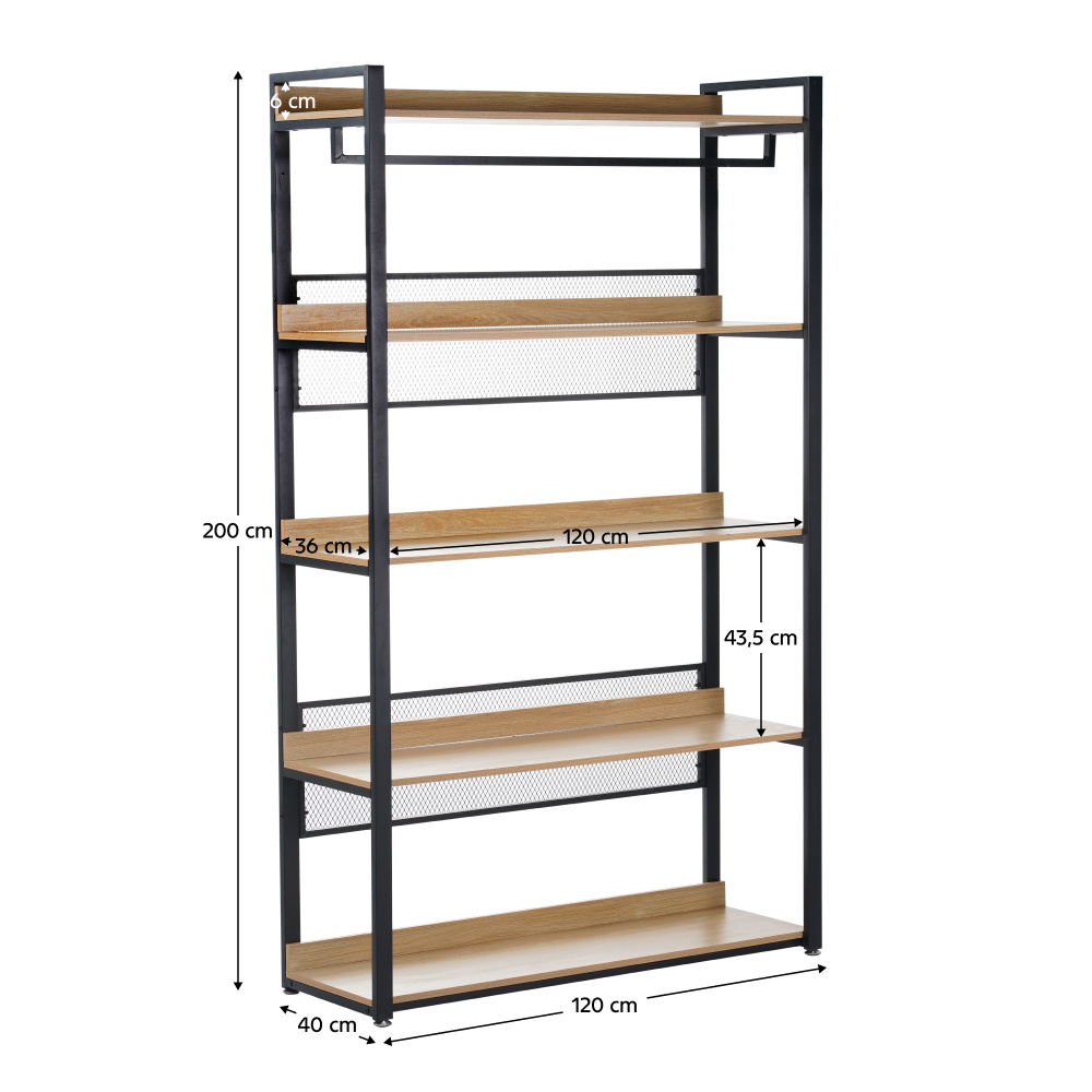 Materiál: ocel/MDF laminovaná Barva: černá/dub Rozměry (ŠxHxV): 120x40x200 cm Nosnost na jednu polici: 20 kg Tloušťka police: 1,5 cm Tloušťka oceli: 0,08 cm Rozměry police (ŠxH): 120x40 cm 5-policový Víceúčelový Moderní Praktický Kombinovatelný s KILOS NEW TYP 1-5 S vyrovnávacími nožičkami Možnost upevnění na zeď Dodáváno v demontu