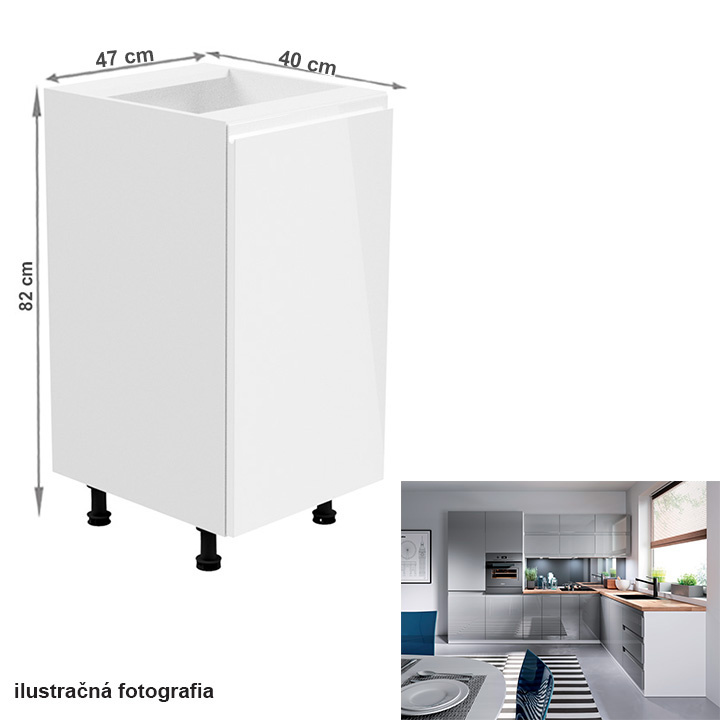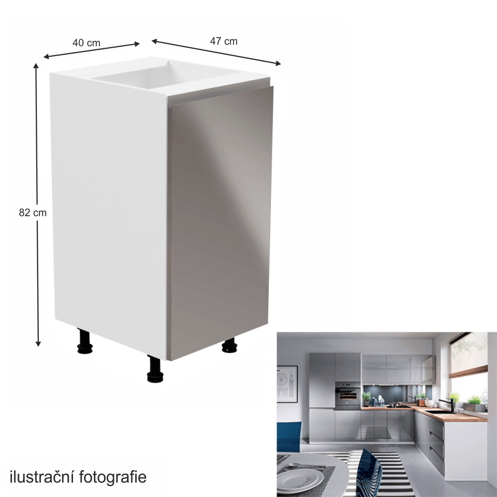 Spodní skříňka, Aurora D40 Provedení: DTD laminové / MDF Barva: bílá / šedá extra vysoký lesk Rozměry (ŠxHxV): 40x47x82 cm Tloušťka materiálu: 15 mm Systém tichého zavírání dvířek Pracovní deska není součástí skříněk. Je možné si doobjednat pracovní desku v provedení dub artisan o tloušťce 38 mm za 1.890 Kč/bm. Možnost dokoupit dřez, dřezovou baterii a příslušenství. Ke spodním skříňkám máte možnost dokoupit spodní lištu/sokl v bílé barvě o rozměru 1 bm za 280 Kč nebo 2 bm za 560 Kč a ukončení na sokl o hloubce 47 cm nebo 58 cm za 210 Kč. Ke každé dolní skříňce, kromě D25PZ, je třeba doobjednat 2 ks úchytek na sokl - cena 40 Kč/2ks.