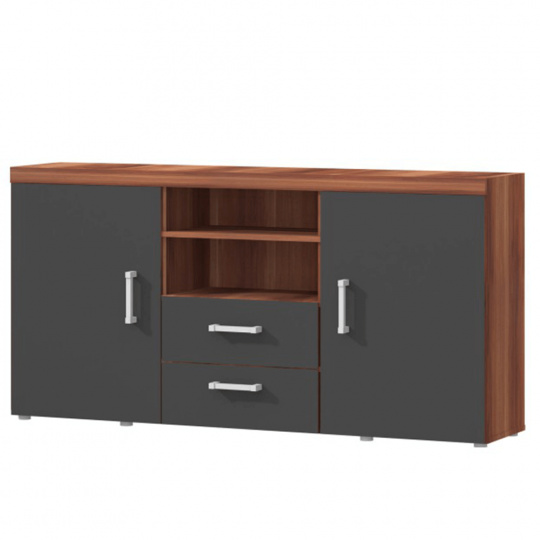 Materiál: DTD laminovaná Barva: švestka / šedý grafit Rozměry (ŠxHxV): 164x45x80 cm Tloušťka materiálu: 16 mm 2 skříňky Otevřený úložný prostor 2 šuplíky Dodávané v demontu