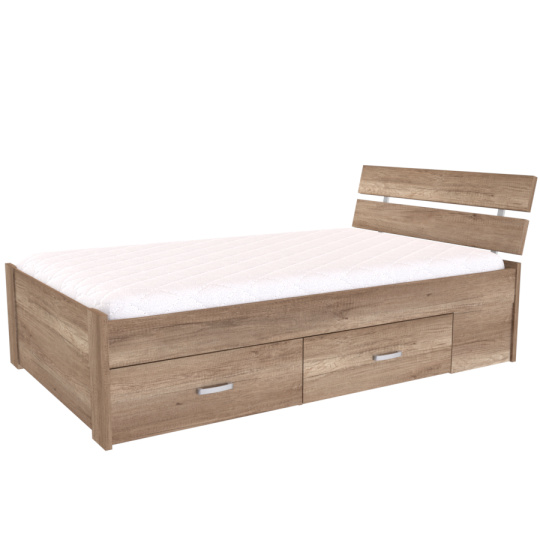 Rustikální design tohoto lůžka vytvoří příjemný prostor pro Váš odpočinek. Zvýšená čela chrání nejen Vaše zdi, ale i Váš spánek. Mezera v těchto čelech dovoluje zdivu odvětrávání a omezuje tak vlhkost kolem lůžka. Několik možností provedení a výběr úložných prostor, nabízí nespočet variant pro Vaši spokojenost. Vyrobeno z lamina o síle 18 / 25 mm. Výběr akčních dekorů. Kvalitní kování a spojovací materiál je bez použití plastových součástek, vyjma ochranných krytek. Zvýšená lehací plocha 52 nebo 56 cm (včetně matrace o výšce 16 cm). Partnerská šířka 120 nebo 140 cm.