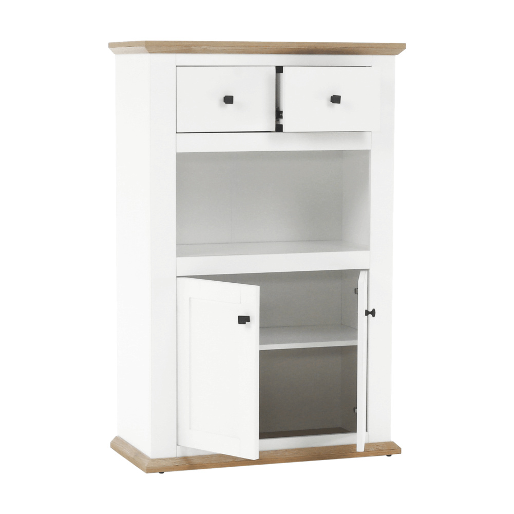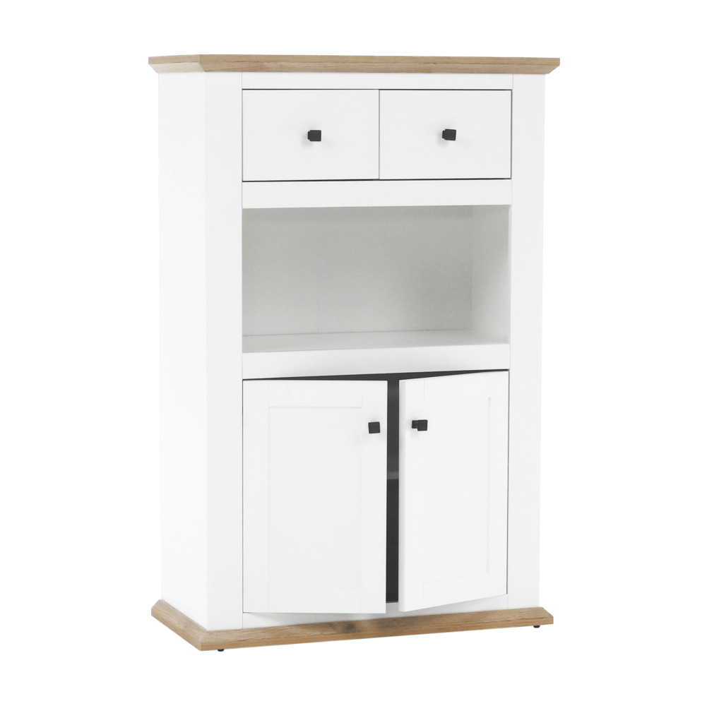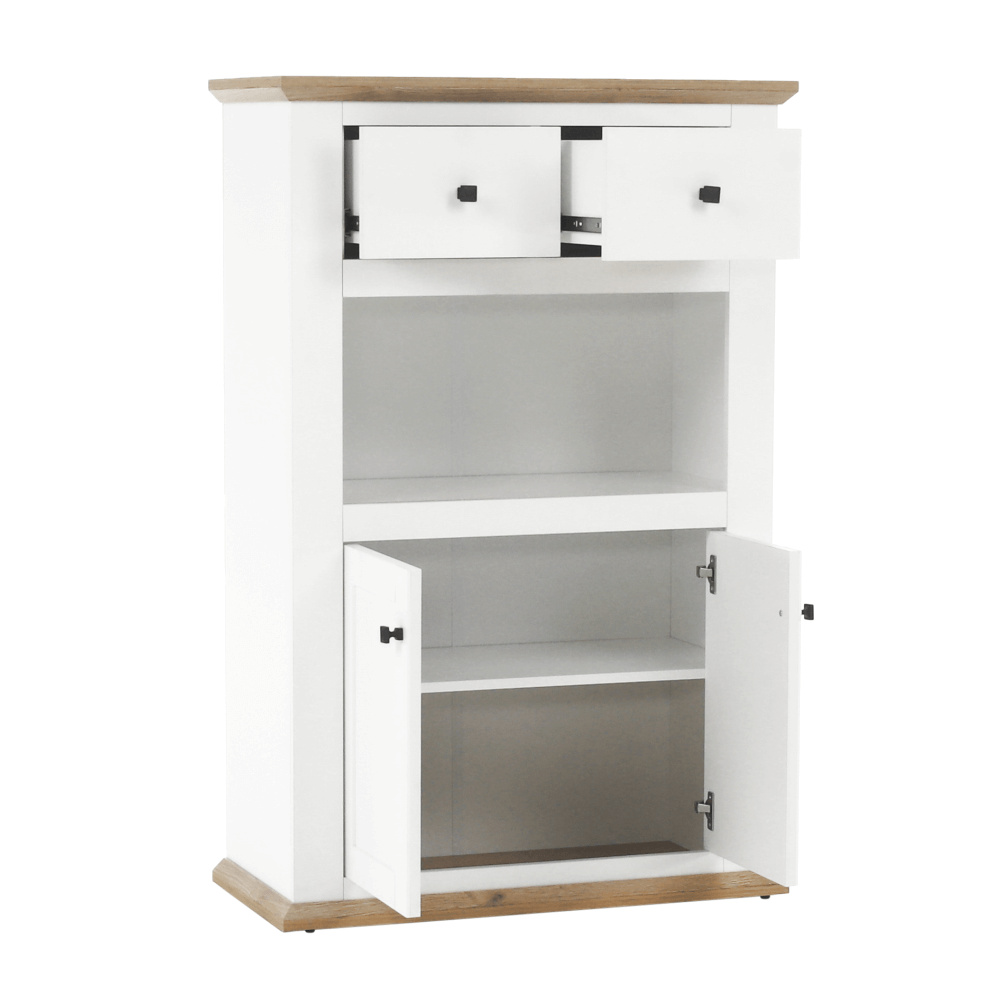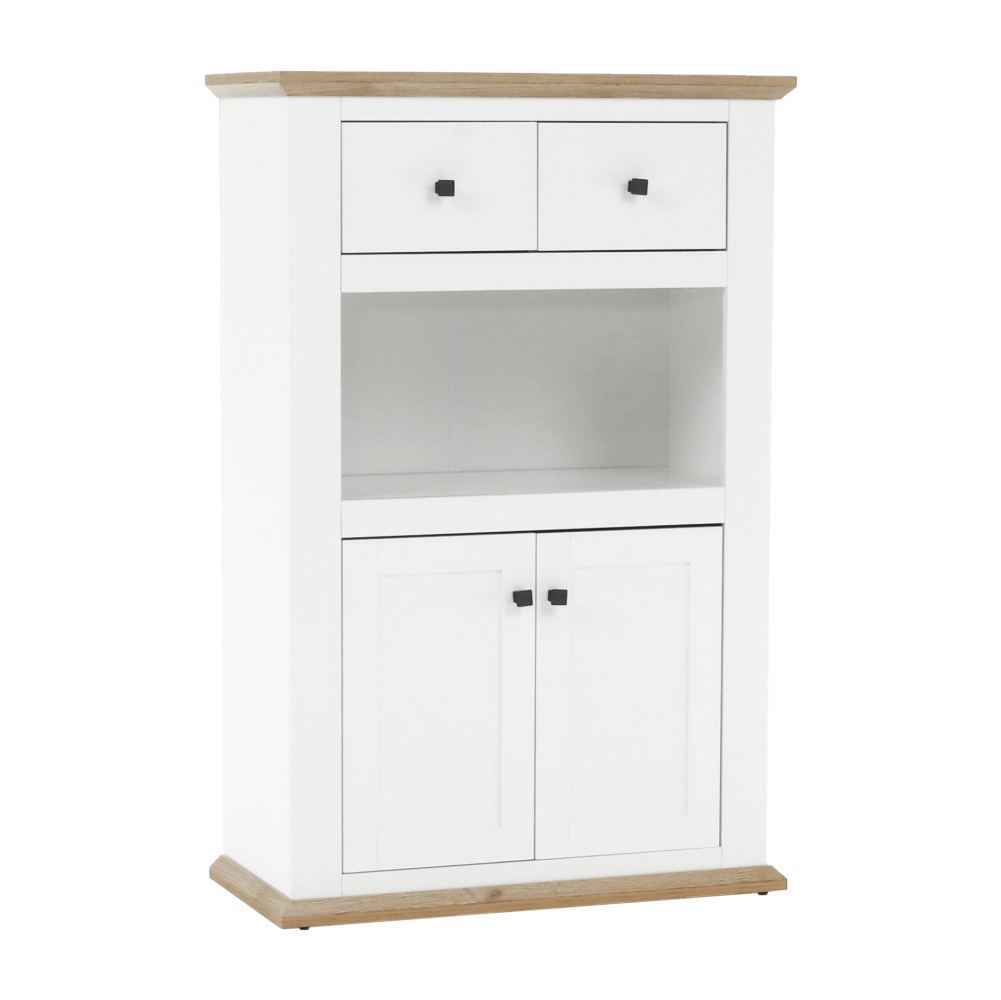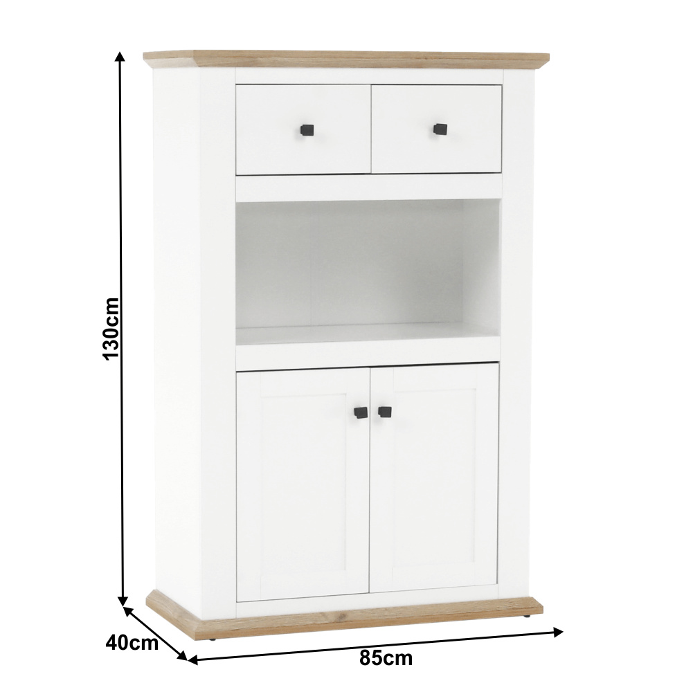 Materiál: DTD laminovaná / ABS hrany Barva: bílá / dub grand Rozměry (ŠxHxV): 85x40x130 cm Tloušťka materiálu: 40 mm dvoudveřová dvě skříňky dva šuplíky S úchytkami S 3D efektem elegantní V provensálském stylu kovové úchytky Dodávané v demontu