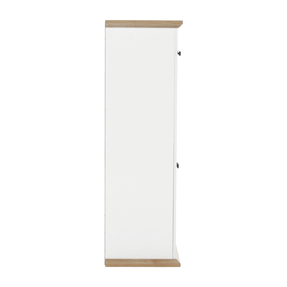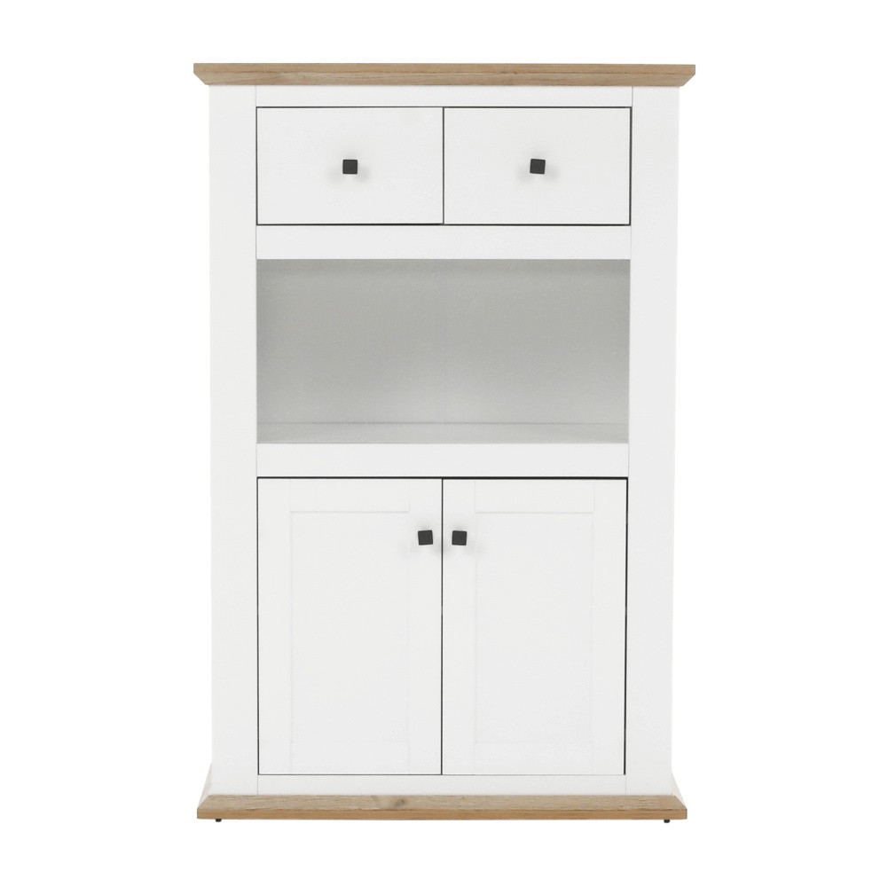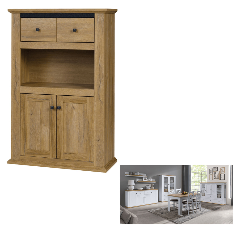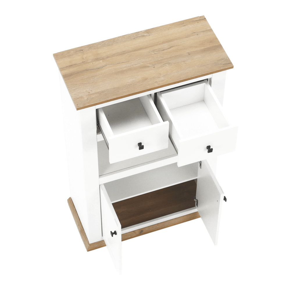 Materiál: DTD laminovaná / ABS hrany Barva: bílá / dub grand Rozměry (ŠxHxV): 85x40x130 cm Tloušťka materiálu: 40 mm dvoudveřová dvě skříňky dva šuplíky S úchytkami S 3D efektem elegantní V provensálském stylu kovové úchytky Dodávané v demontu