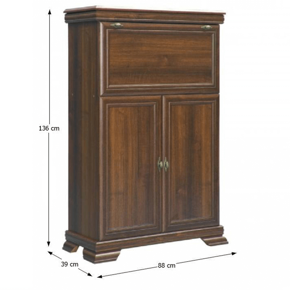 Barová skříňka KORA KK5 Materiál: laminovaná DTD, MDF, kov Barevné provedení: samoa king. Rozměry (ŠxHxV): 88x39x136 cm Tloušťka materiálu korpus: 15 mm Tloušťka materiálu vrchní desky: 22 mm Tloušťka materiálu dolní desky: 22 mm Výška spodního prostoru od podlahy: 10,5 cm Dodávané v demontu.