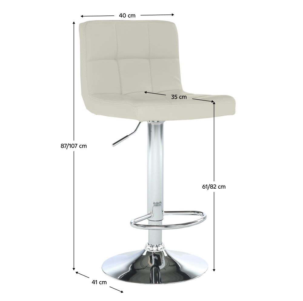 Materiál: Velvet látka/chrom Oděruodolnost textilie podle testu Martindale: 80 000 oděrů Barva: béžová/chrom Rozměry (ŠxHxV): 53x50x80/102 cm Výška sedu: 63/83 cm Hloubka sedu: 40 cm Šířka sedu: 40 cm Šířka zádové opěrky: 43 cm Výška zádové opěrky: 21 cm Průměr podstavy: 38 cm Nosnost: 100 kg Otočná Možnost nastavit výšku sedu Prošívaná D