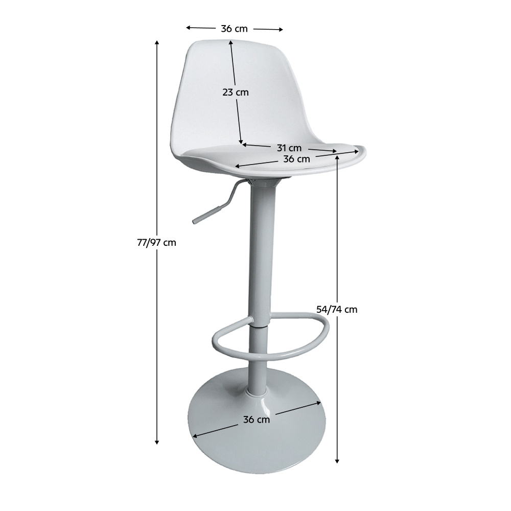 Materiál konstrukce: plast/kov Barva: bílá Materiál čalouněné sedátko: ekokůže Oděruodolnost textilie podle testu Martindale: 100 000 oděrů Barva: bílá Rozměry (ŠxHxV): 36x36x77-97 cm Výškově nastavitelné sedátko Nastavení pomocí páčky Extra měkké sedátko Otočné sedátko Obruč jako podnož na nohy Výška sedu: 54-74 cm Hloubka sedu: 31 cm Šířka sedu: 36 cm Opěrka zad (ŠxV): 36x23 cm Nosnost: 110 kg Dodáváno v demontu