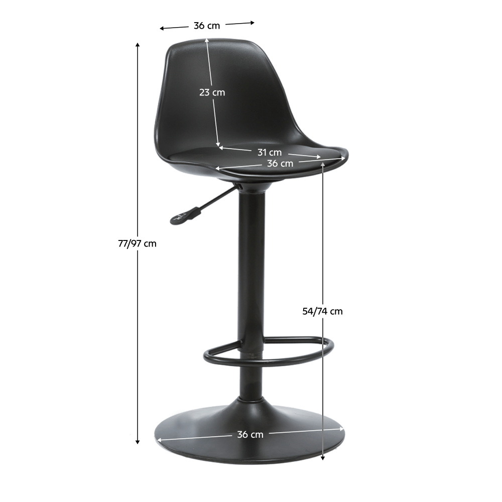 Materiál konstrukce: plast/kov Barva: černá Materiál čalouněné sedátko: ekokůže Oděruodolnost textilie podle testu Martindale: 100 000 oděrů Barva: černá Rozměry (ŠxHxV): 36x36x77-97 cm Výškově nastavitelné sedátko Nastavení pomocí páčky Extra měkké sedátko Otočné sedátko Obruč jako podnož na nohy Výška sedu: 54-74 cm Hloubka sedu: 31 cm Šířka sedu: 36 cm Opěrka zad (ŠxV): 36x23 cm Nosnost: 90 kg Dodáváno v demontu