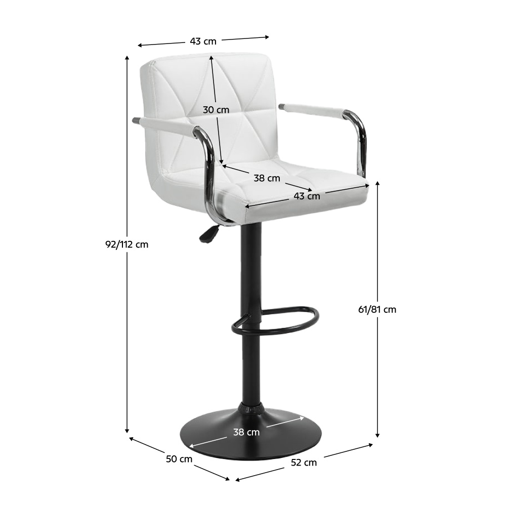 Materiál: ekokůže/kov Oděruodolnost textilie podle testu Martindale: 100 000 oděrů Barva: bílá/černá Rozměry (ŠxHxV): 52x50x92-112 cm Průměr podstavy: 38 cm Výška sedu: 61-81 cm Hloubka sedu: 38 cm Šířka sedu: 43 cm Výška zádové opěrky: 30 cm Šířka zádové opěrky: 43 cm Nosnost: 100 kg S otočným výškově nastavitelným sedadlem Opěrka na nohy Opěrky na ruce Dekorativní prošití Dodáváno v demontu