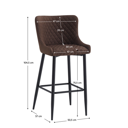 Materiál: látka/kov Oděruodolnost textilie podle testu Martindale: 65 000 oděrů Barva: hnědá/černá Rozměry (ŠxHxV): 51x56x105,5 cm Výška sedu: 75,5 cm Hloubka sedu: 42 cm Šířka sedu: 38 cm Šířka zádové opěrky: 47 cm Výška zádové opěrky: 33,5 cm Nosnost: 100 kg Hmotnost: 8,6 kg Dekorativní prošití Opěrka na nohy Designová Dodáváno v demontu