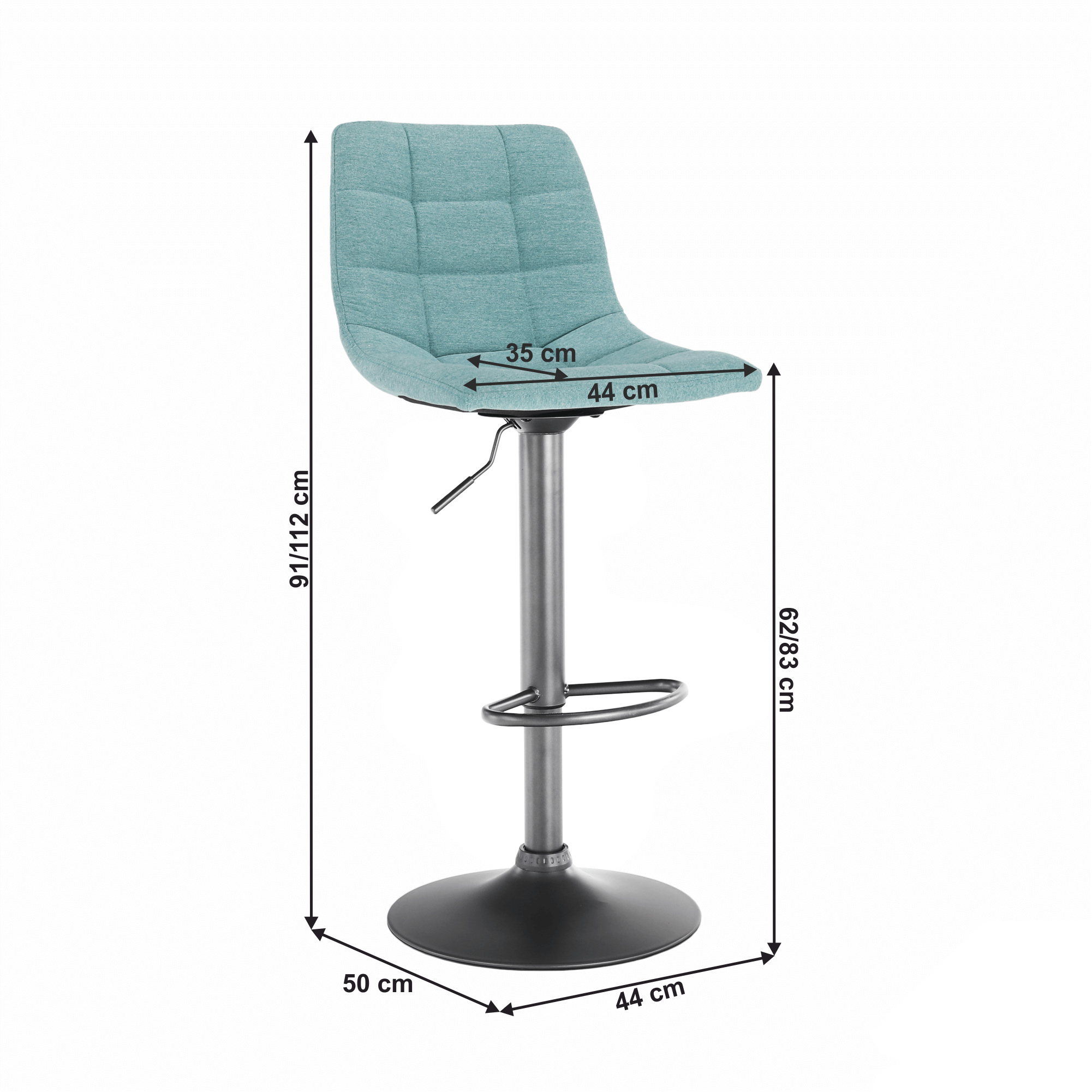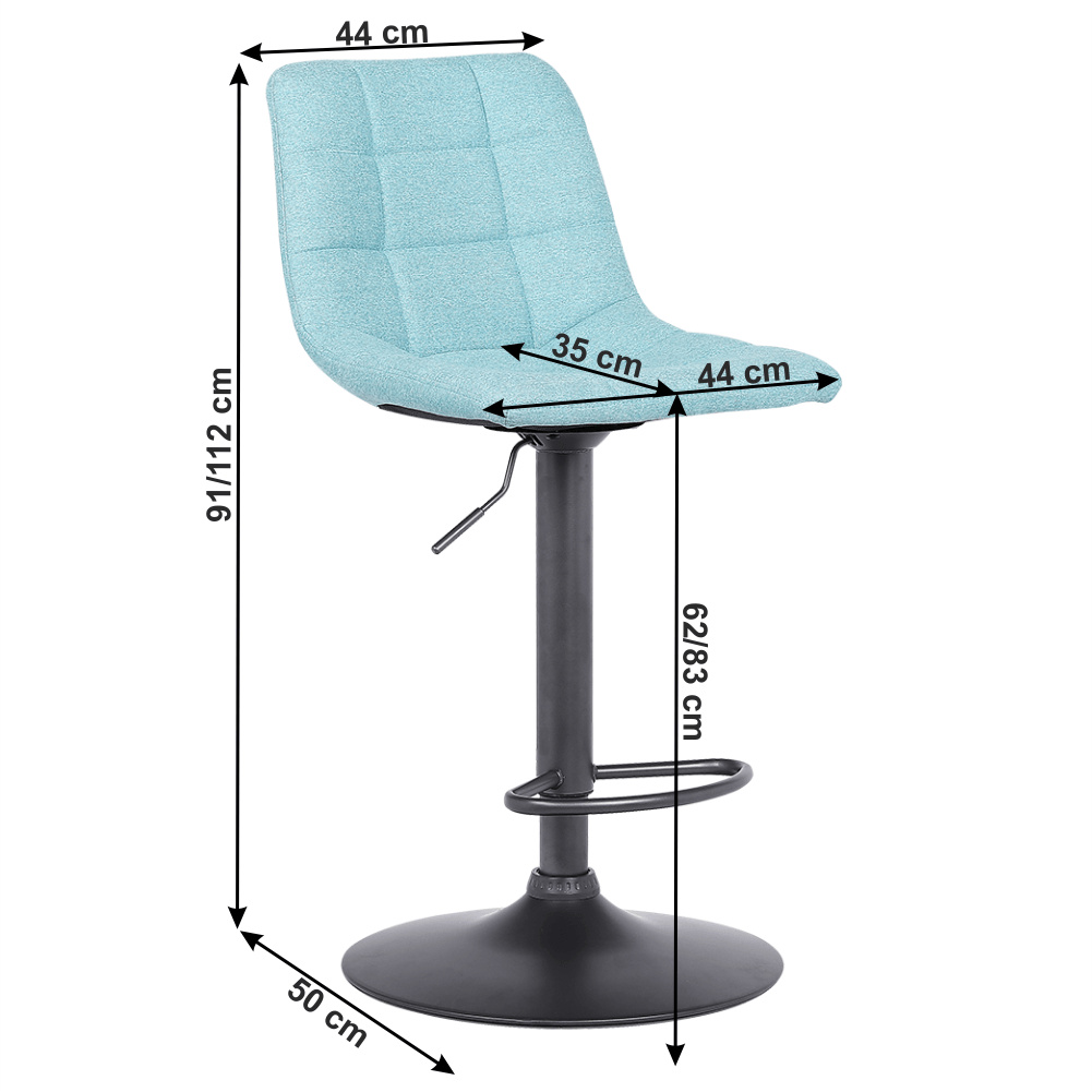 Materiál konstrukce: kov Barva: černá Materiál čalouněné sedadlo: látka Oděruodolnost textilie podle testu Martindale: 65 000 oděrek Barva: mentolová Rozměry (ŠxHxV): 44x50x91-112 cm Výška sedu: 62-83 cm Hloubka sedu: 35 cm Šířka sedu: 44 cm Nosnost: 100 kg Výškově nastavitelné sedadlo Nastavení pomocí páčky otočné sedadlo Obruč jako podnož na nohy dekorativní prošití Dodávané v demontu