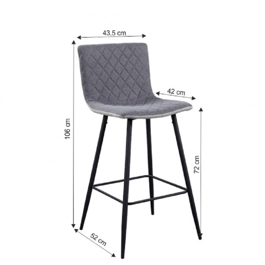 Barová židle TORANA Barva: světlešedá / šedá / černá Materiál: látka / kov Oděruodolnost textilie podle testu Martindale: 50 000 oděrek Rozměry (ŠxHxV): 43,5x52x106 cm Výška sedu: 72 cm Hloubka sedu: 42 cm Nosnost: 90 kg Prošívaná sedací část. Dodávané v demontu.