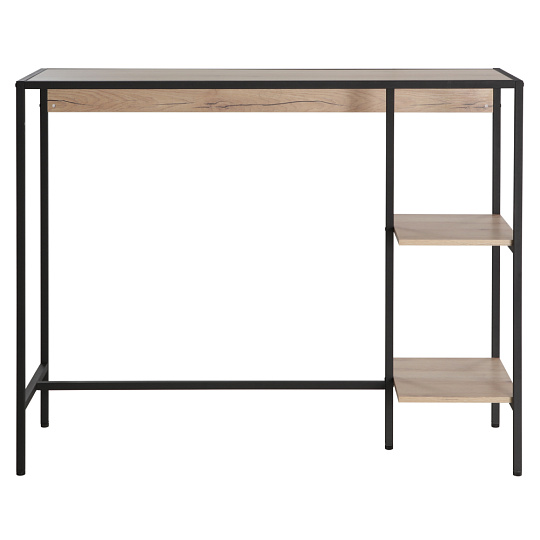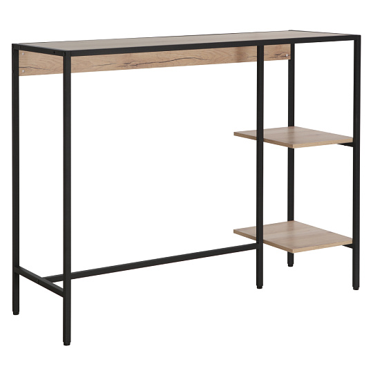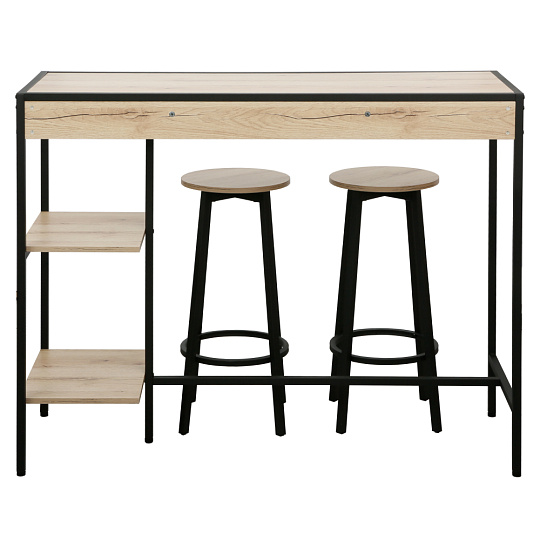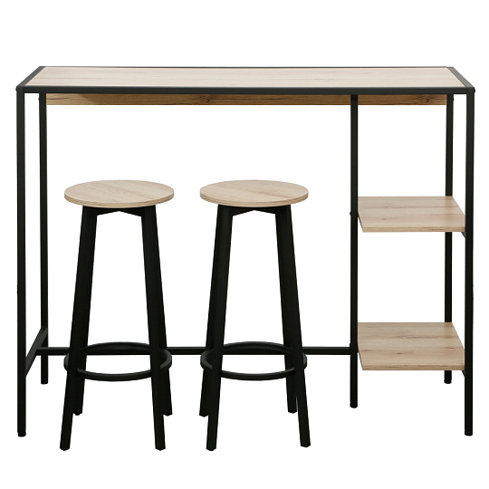Materiál: melaminová PB deska/kov Barva: dub/černá Rozměry stolu (ŠxHxV): 124x44x100 cm Rozměry židle (ŠxHxV): 38x38x70 cm Výška sedu: 70 cm Hloubka sedu: 30 cm Tloušťka materiálu PB desky: 1,5 cm 3-dílný set Stůl 2x židle S policemi Nosnost stolu: 40 kg Nosnost židle: 60 kg Praktický Industriální styl Dodáváno v demontu
