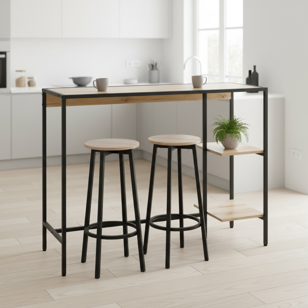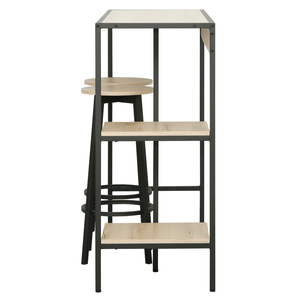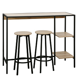 Materiál: melaminová PB deska/kov Barva: dub/černá Rozměry stolu (ŠxHxV): 124x44x100 cm Rozměry židle (ŠxHxV): 38x38x70 cm Výška sedu: 70 cm Hloubka sedu: 30 cm Tloušťka materiálu PB desky: 1,5 cm 3-dílný set Stůl 2x židle S policemi Nosnost stolu: 40 kg Nosnost židle: 60 kg Praktický Industriální styl Dodáváno v demontu