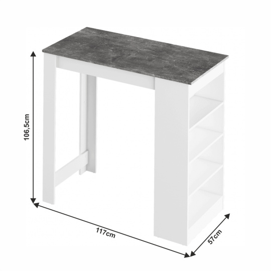Barový stůl Austen Barva: bílá / beton Materiál: DTD laminovaná Rozměry (ŠxHxV): 117x57x106,5 cm Tloušťka materiálu: 16 mm úložný prostor Kvalitní slovenský výrobek. Dodávané v demontu