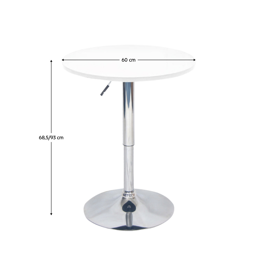 Materiál: MDF/chrom Barva: bílá/chromovaná Rozměry (ŠxHxV): 60x60x85,5-105,5 cm Tloušťka materiálu: 20 mm Nosnost: 100 kg Výškově nastavitelný Nastavení výšky zajišťuje píst Stůl je otočný Dodáváno v demontu