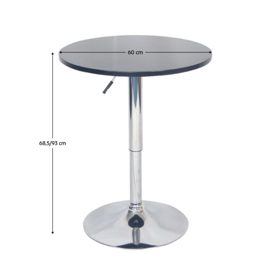 Materiál: MDF/chrom Barva: černá/chromovaná Rozměry (ŠxHxV): 60x60x85,5-105,5 cm Tloušťka materiálu: 20 mm Nosnost: 100 kg Výškově nastavitelný Nastavení výšky zajišťuje píst Stůl je otočný Dodáváno v demontu