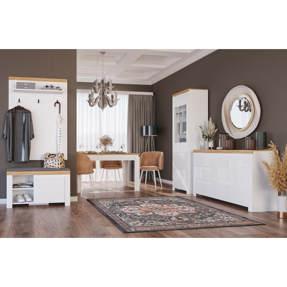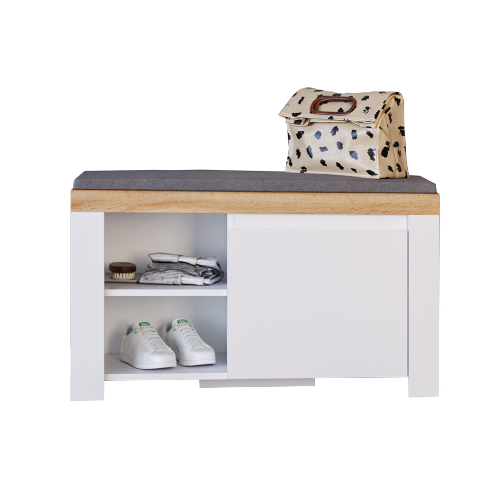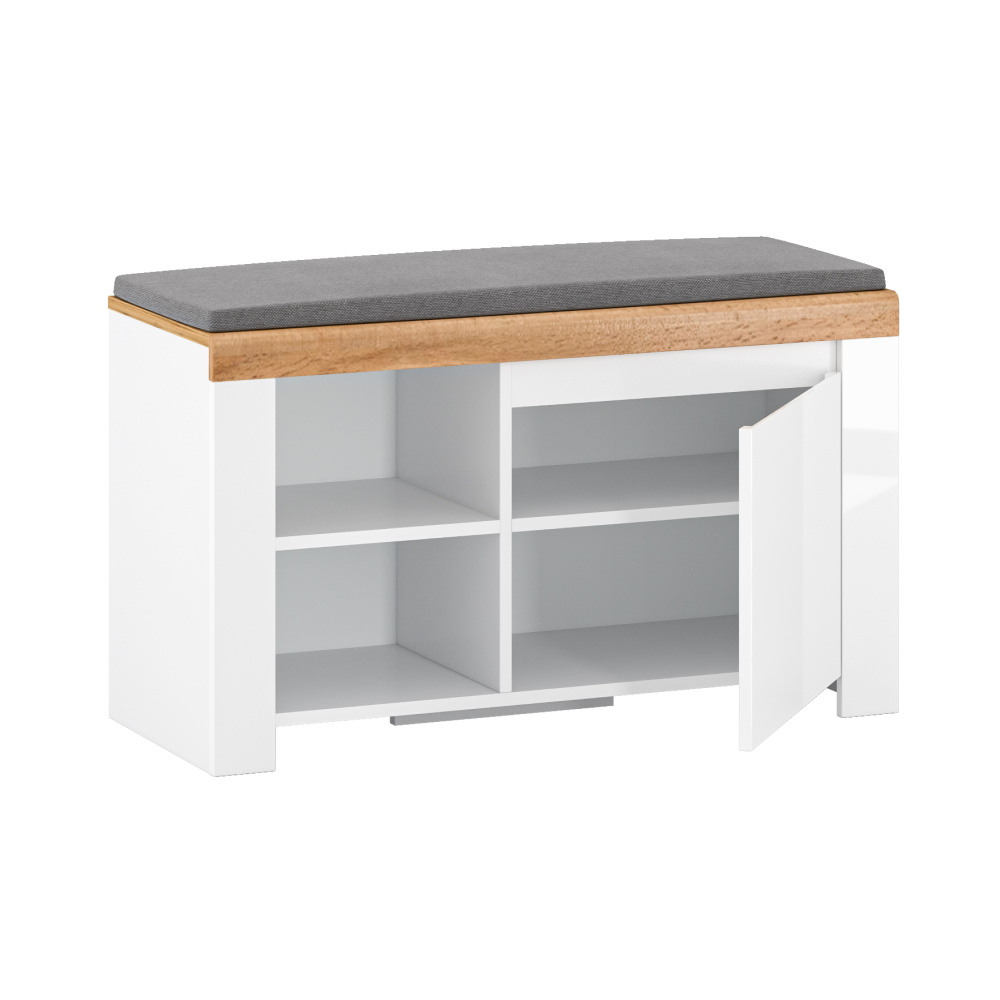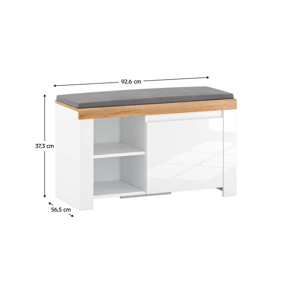 Materiál: DTD laminovaná/ABS hrany/MDF Barva: bílý extra vysoký lesk/dub wotan Rozměry (ŠxHxV): 92,6x37,3x56,5 cm Tloušťka materiálu: 1,6 - 2,2 cm Úložný prostor Jedna skříňka S policemi Nosnost police: 3 kg Nosnost botníku: 70 kg MDF dvířka Otevírání/zavírání pomocí výřezu Dodáváno s polštářem na suchý zip Jen na objednávku Dodací lhůta je 3-5 týdnů Dodáváno v demontu