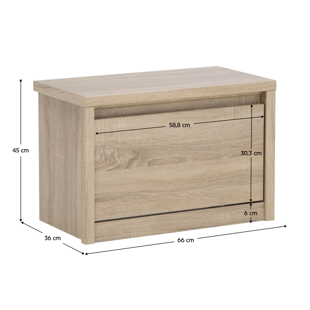 Materiál: DTD laminovaná Barva: dub sonoma Rozměry (ŠxHxV): 66x36x45 cm Tloušťka materiálu: 3,2 cm Tloušťka materiálu zbývající části: 1,6 cm Úložný prostor Skříňka s výklopem Dodáváno v demontu