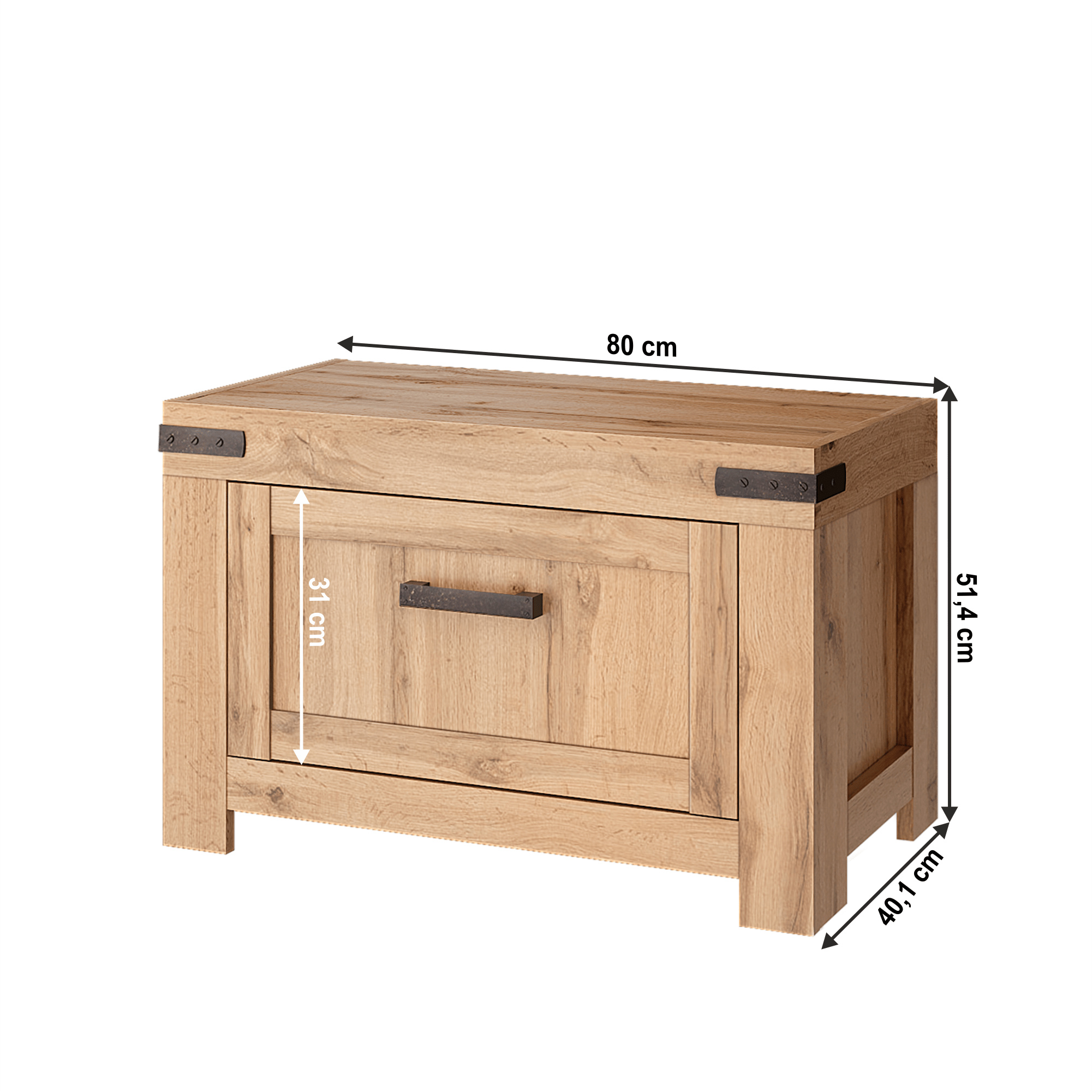 Botník MORATIZ 1K Materiál: DTD laminovaná/MDF/plast Barva: dub wotan Rozměry (ŠxHxV): 80x40,1x51,4 cm Výška nožiček 7 cm Tloušťka materiálu: 1,6 - 2,2 cm Skříňka s výklopem Police Výška skříňky: 31cm Plastový dekor a úchytky MDF dvířka Dodávána v demontu