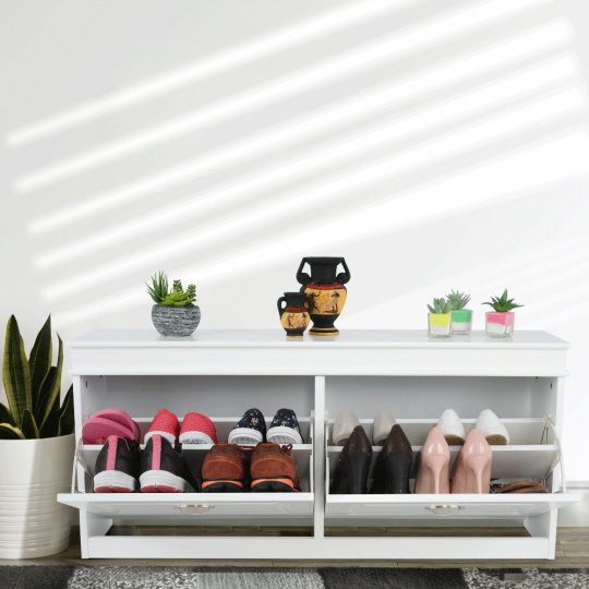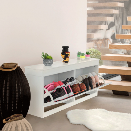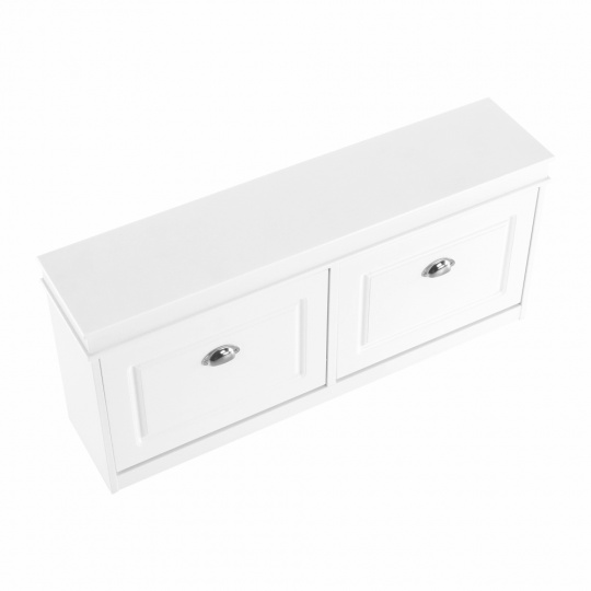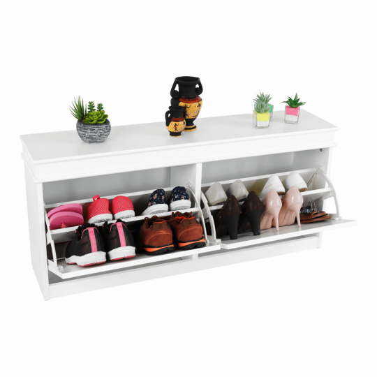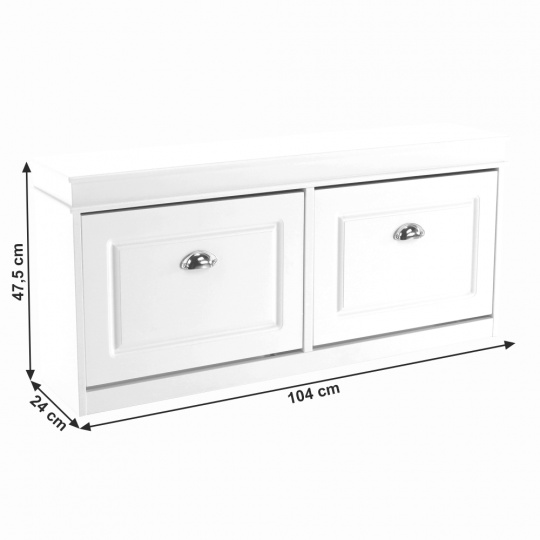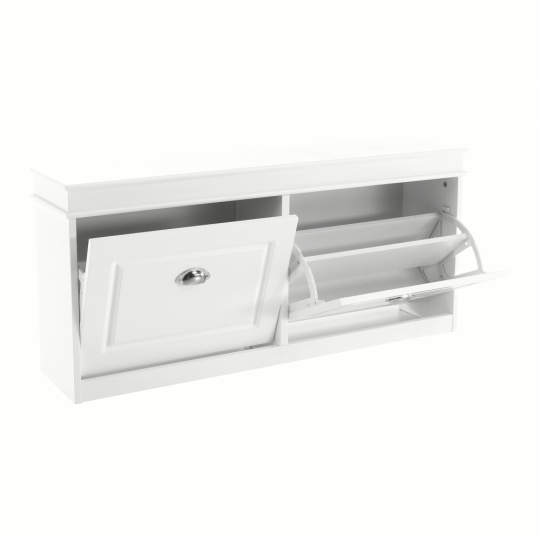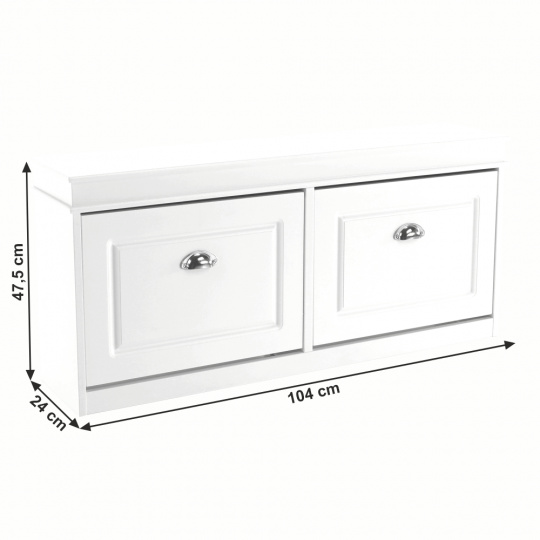 Barva: bílá Materiál: MDF / dřevotříska Rozměry (ŠxHxV): 104x24x47,5 cm 2-řadový výklopný Dodávané v demontu.