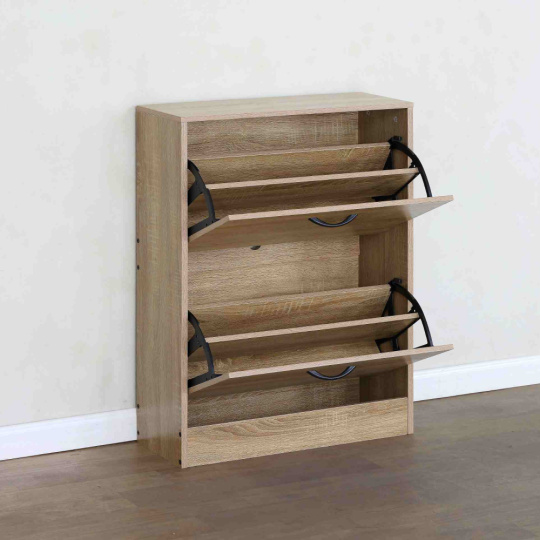 Materiál: dřevotříska/plast Barva: dub Rozměry (ŠxHxV): 60x24x81 cm Tloušťka materiálu: 1,2-1,5 cm Dva výklopné šuplíky Šuplík rozdělen na 2 části Výška spodního prostoru od podlahy: 9 cm Rozměry výklopného šuplíku (ŠxV): 56,4x34,5 cm Nosnost výklopného šuplíku: 6 kg Nosnost vrchní desky: 10 kg Moderní design Praktický Dodáváno v demontu