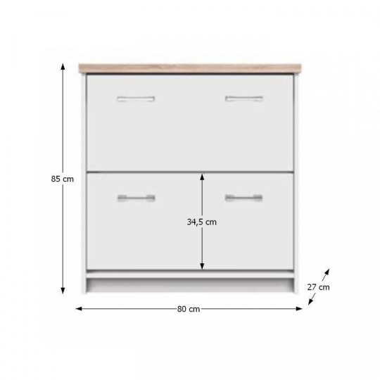 Botník 2K TOPTY TYP 11 Materiál: DTD laminovaná Provedení: bílá / dub sonoma Rozměry (ŠxHxV): 80x27x85 cm Tloušťka materiálu korpus: 16 mm Tloušťka materiálu vrchní desky: 32 mm Dodávané v demontu.