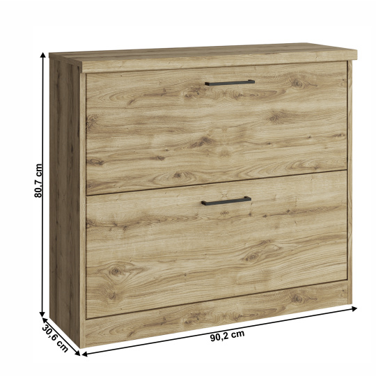 Botník DORSI 2K Materiál: DTD laminovaná/MDF Barva: dub navarra Rozměry (ŠxHxV): 90,2x30,6x80,7 cm Tloušťka materiálu: 1,6 cm Dva výklopné úložné prostory Nosnost vrchní desky: 10 kg Nosnost výklopného šuplíku: 3 kg Plastové úchytky Barva úchytek: černá Moderní design Dodáváno v demontu