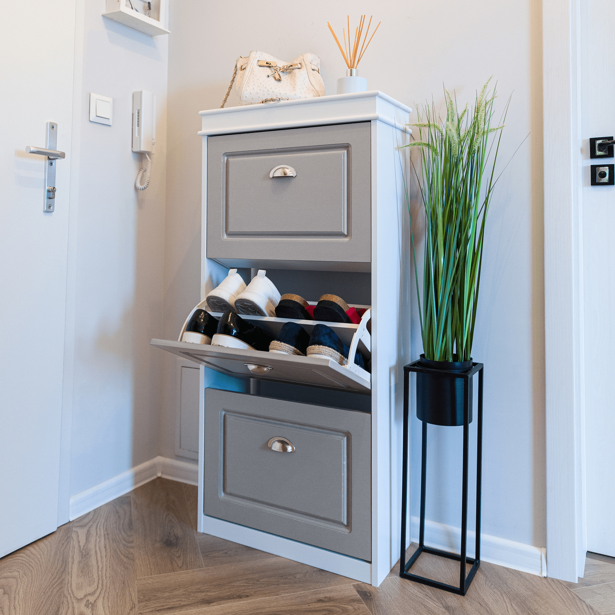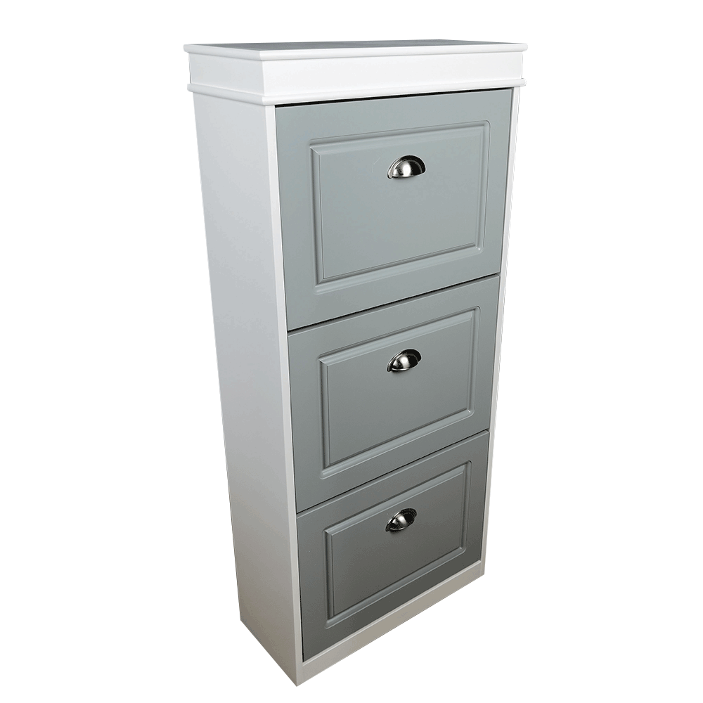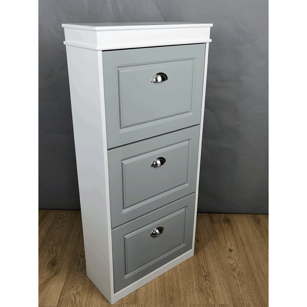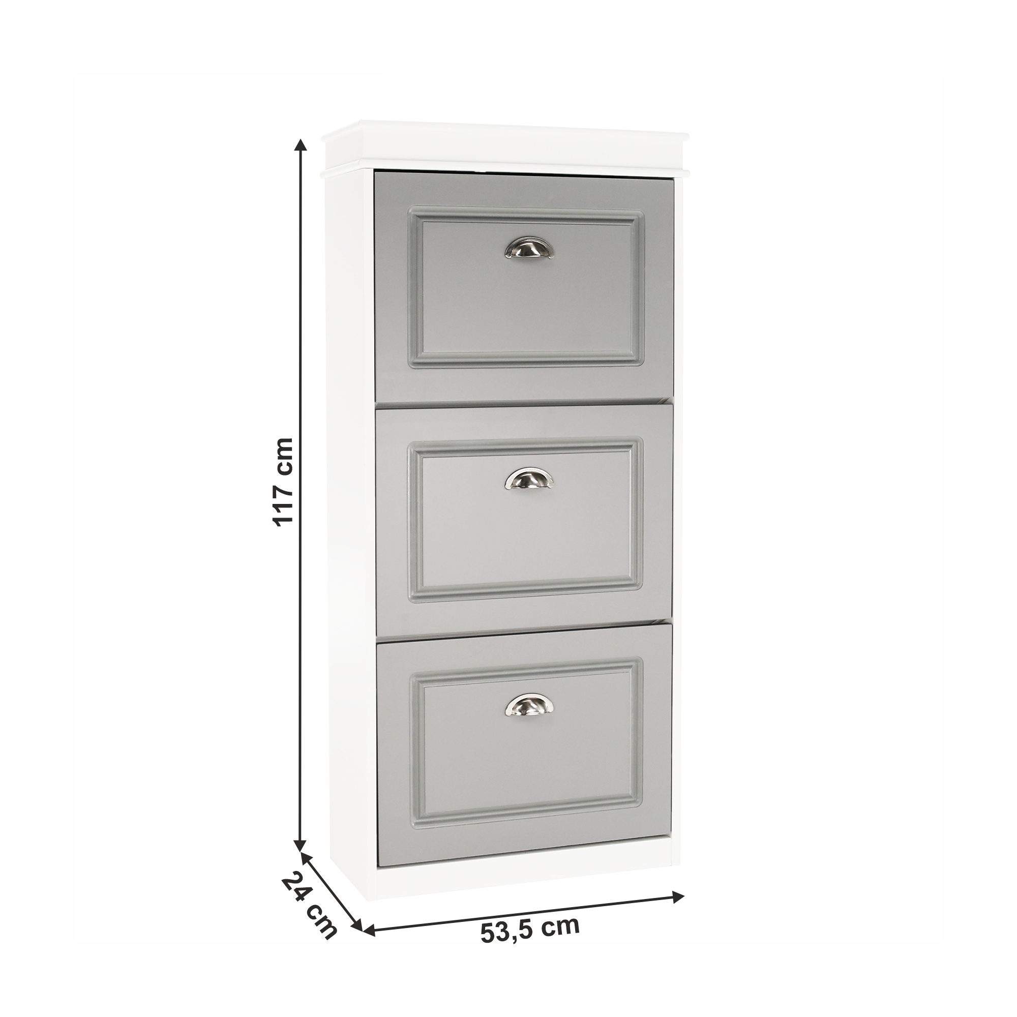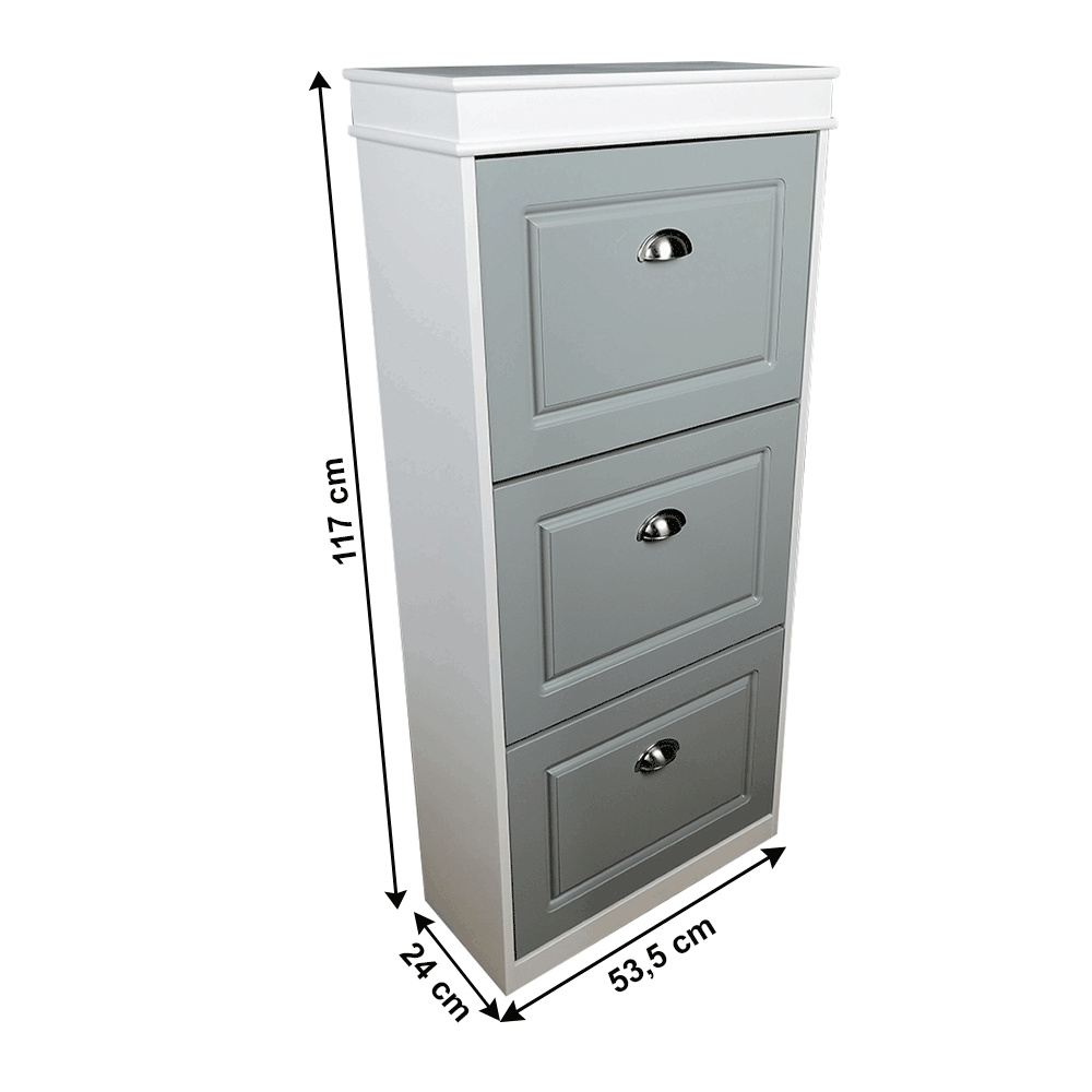 Materiál: MDF / dřevotříska Barva: šedá / bílá Rozměry (ŠxHxV): 53,5x24x117 cm 3-řadový Nosnost: 75 kg Vhodný na 12 párů bot výklopné šuplíky S úchytkami Dodávané v demontu