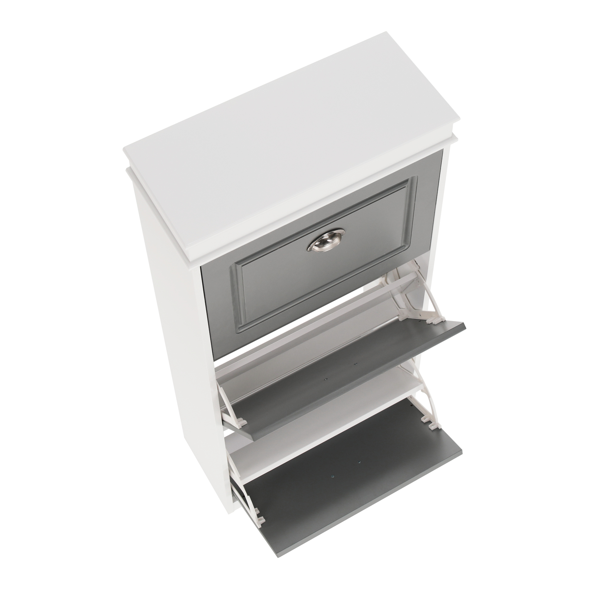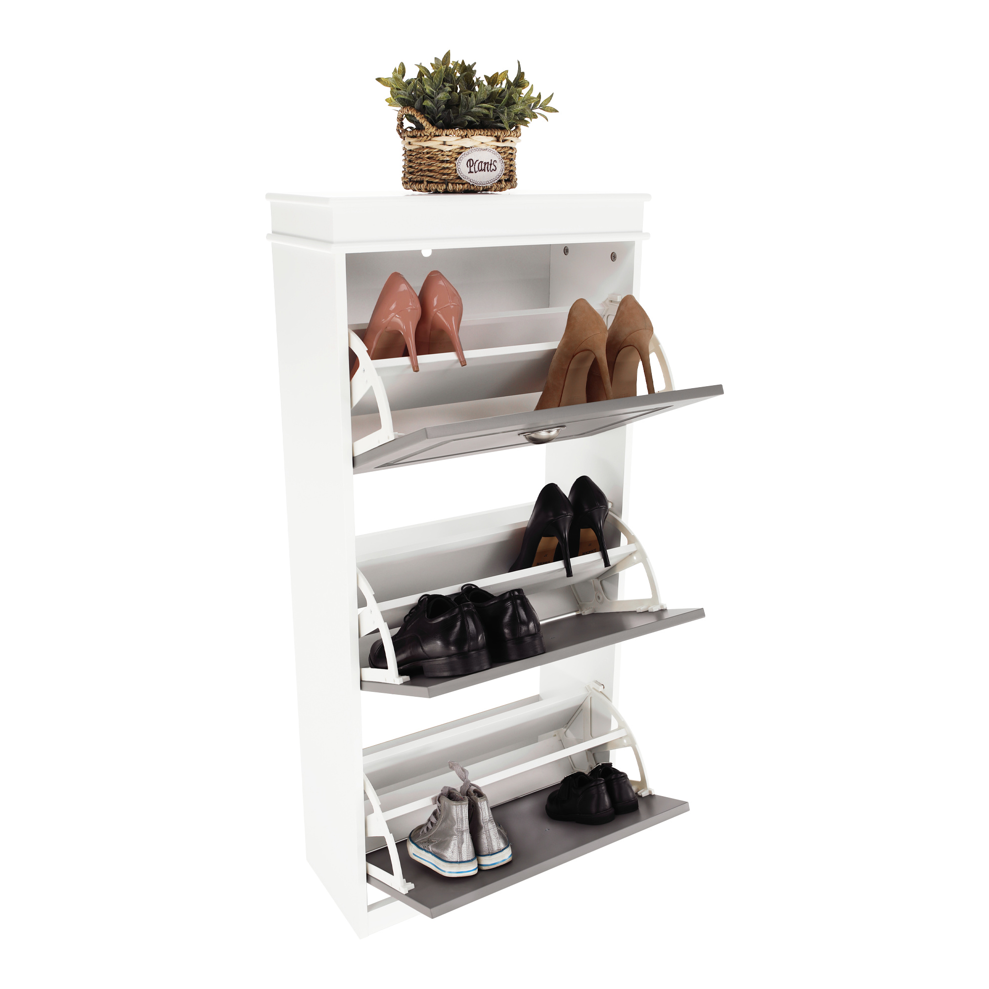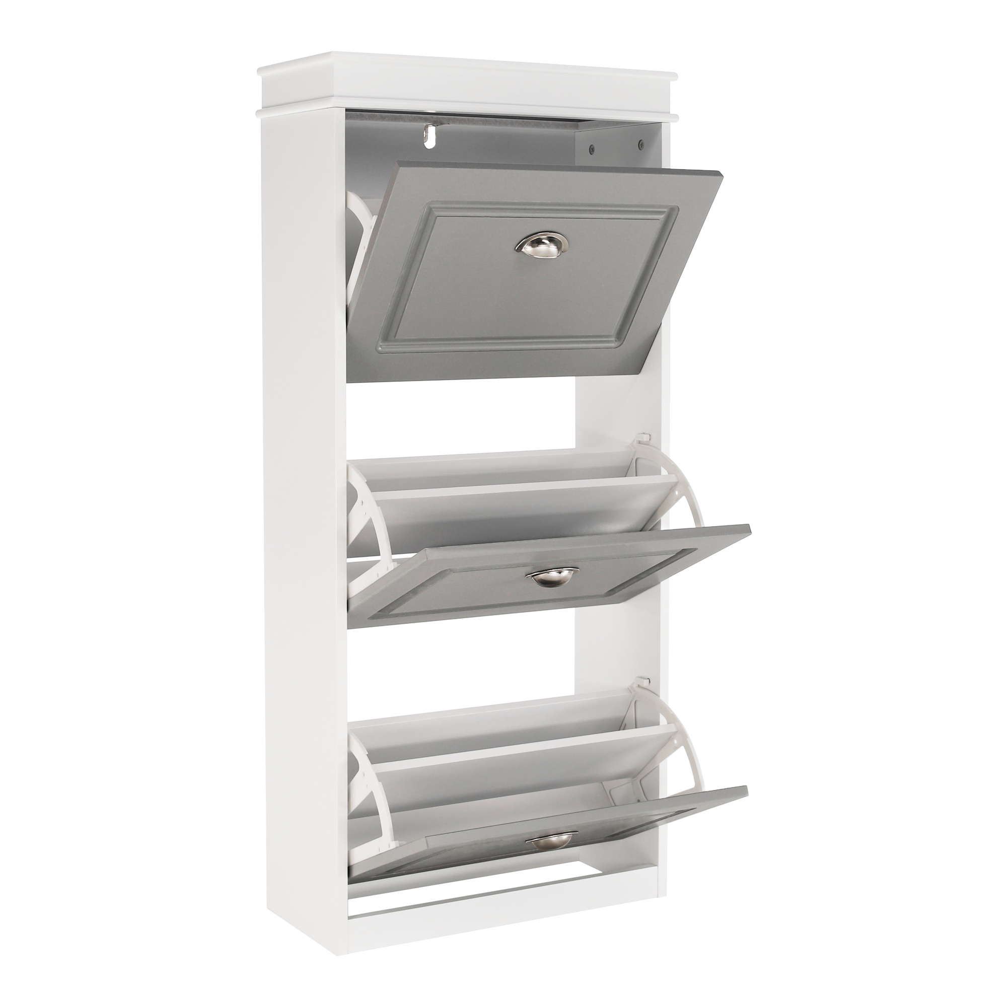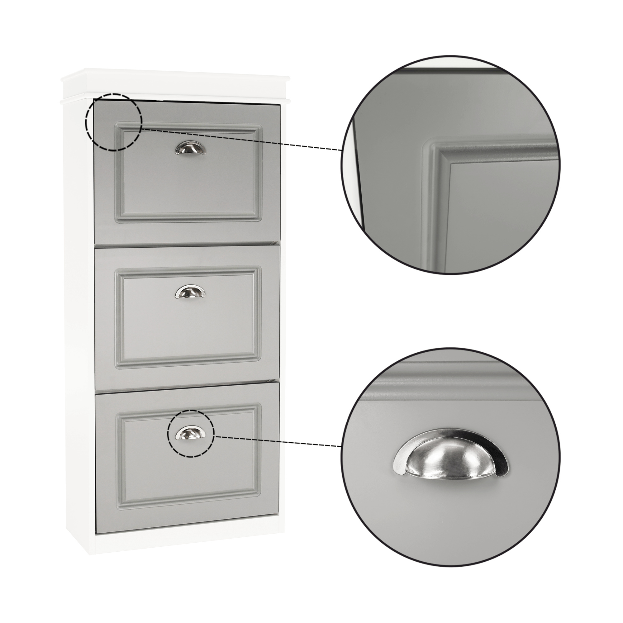 Materiál: MDF / dřevotříska Barva: šedá / bílá Rozměry (ŠxHxV): 53,5x24x117 cm 3-řadový Nosnost: 75 kg Vhodný na 12 párů bot výklopné šuplíky S úchytkami Dodávané v demontu