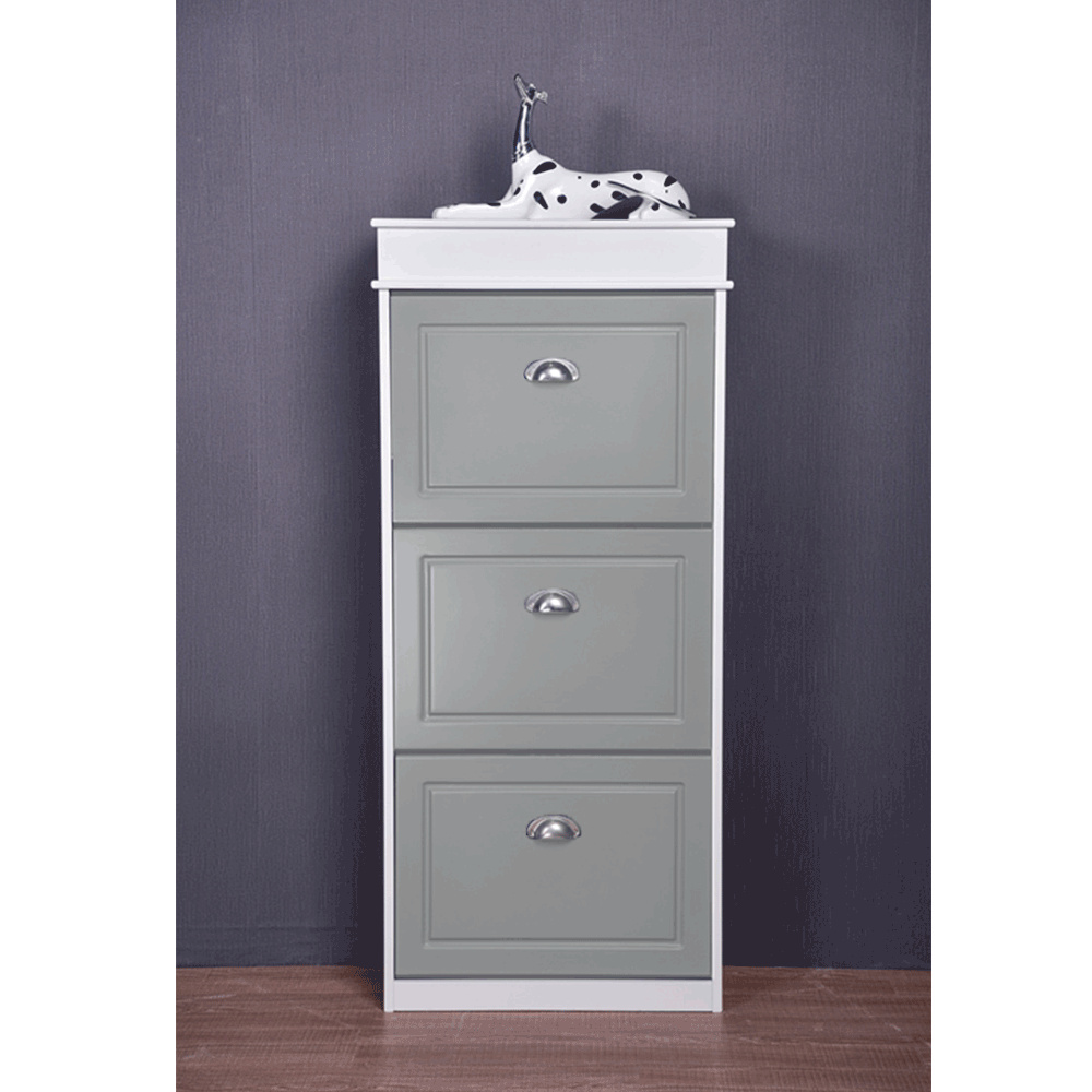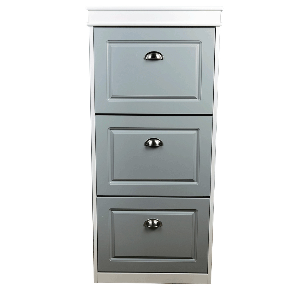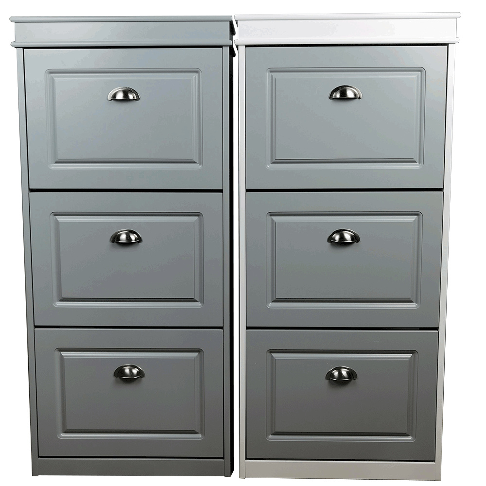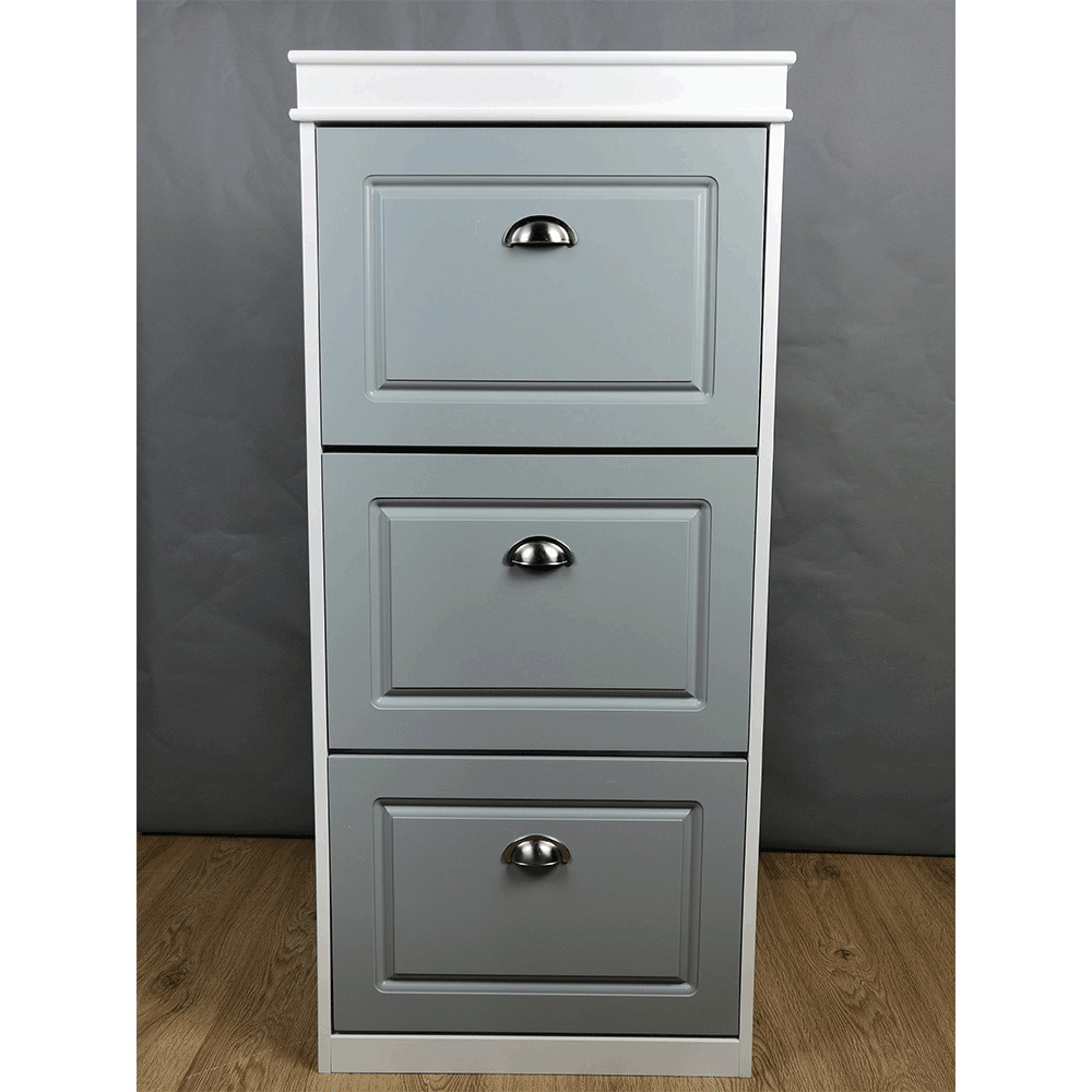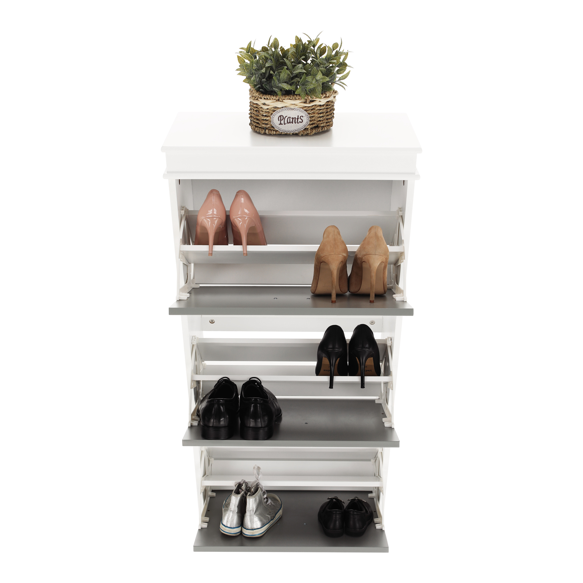 Materiál: MDF / dřevotříska Barva: šedá / bílá Rozměry (ŠxHxV): 53,5x24x117 cm 3-řadový Nosnost: 75 kg Vhodný na 12 párů bot výklopné šuplíky S úchytkami Dodávané v demontu