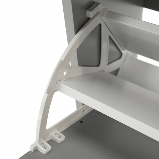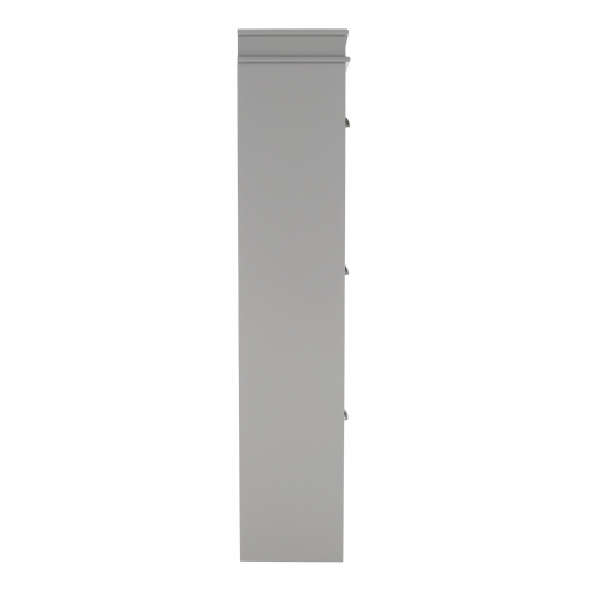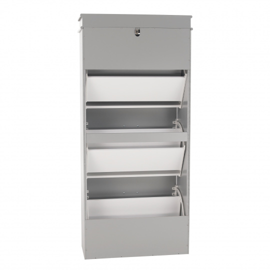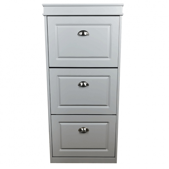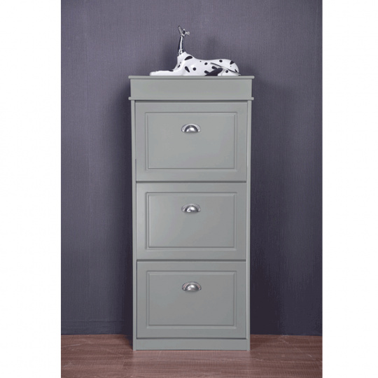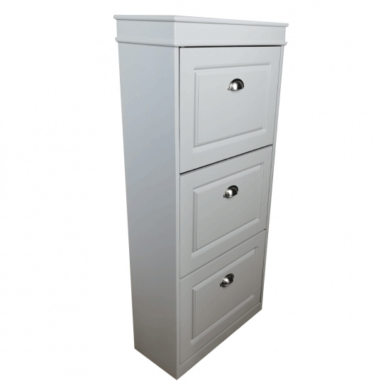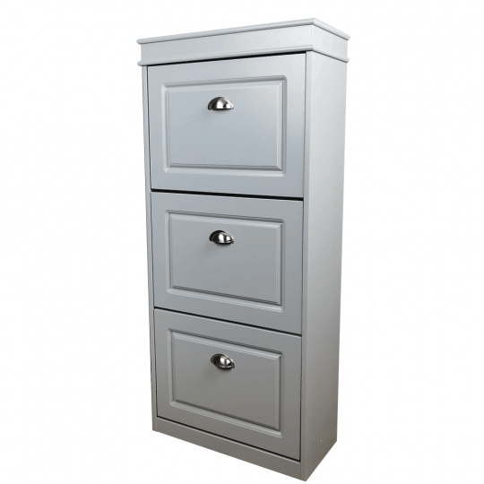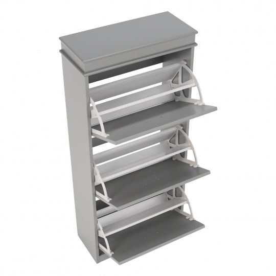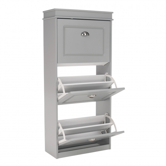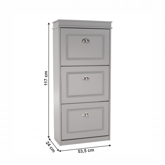 Materiál: MDF / dřevotříska Barva: šedá Rozměry (ŠxHxV): 53,5x24x117 cm 3-řadový Nosnost: 75 kg Vhodný na 12 párů bot výklopné šuplíky S úchytkami Dodávané v demontu