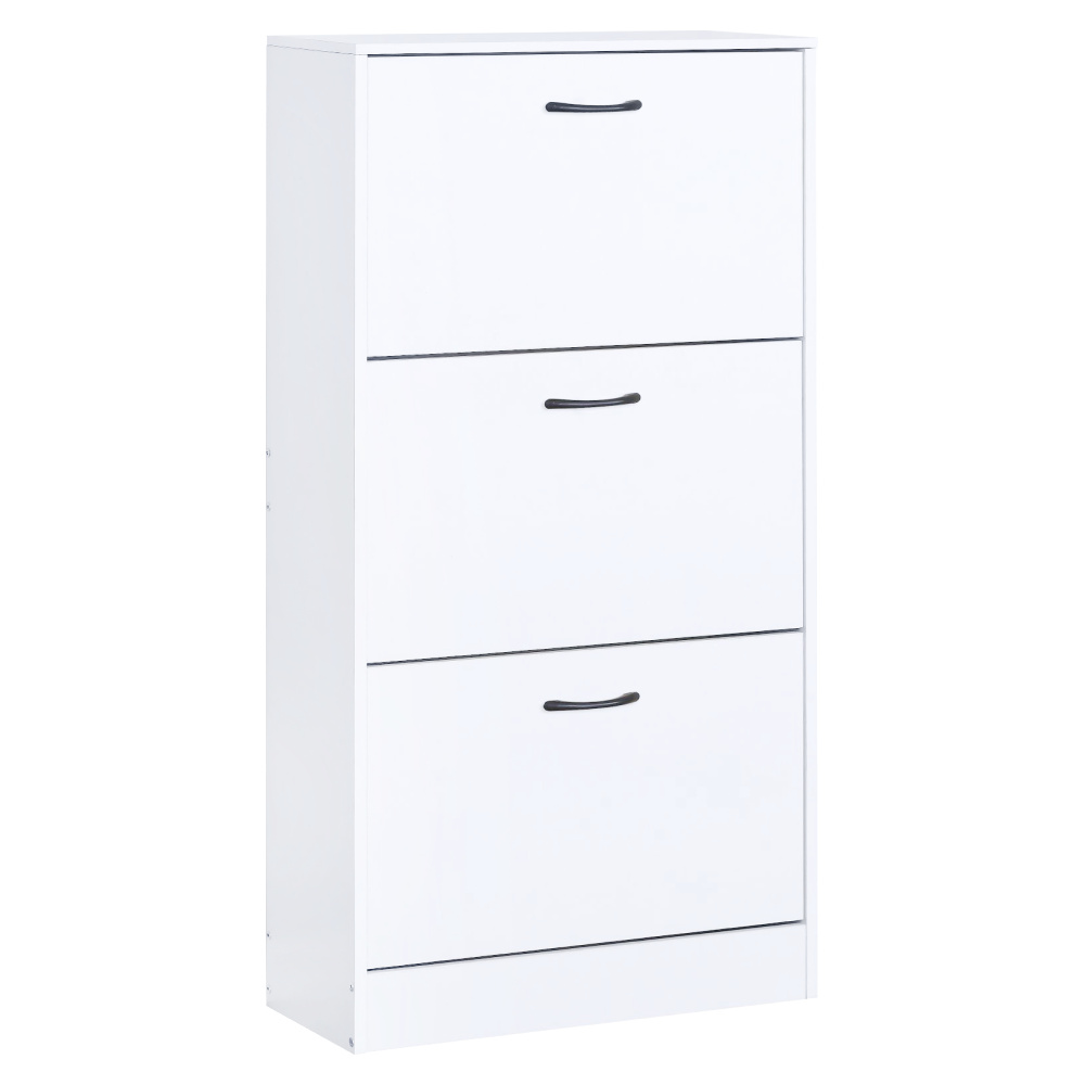 Materiál: dřevotříska/plast Barva: bílá Rozměry (ŠxHxV): 60x24x116 cm Tloušťka materiálu: 1,2-1,5 cm Tři výklopné šuplíky Šuplík rozdělen na 2 části Výška spodního prostoru od podlahy: 9 cm Rozměry výklopného šuplíku (ŠxV): 56,4x34,5 cm Nosnost výklopného šuplíku: 6 kg Nosnost vrchní desky: 10 kg Moderní design Praktický Dodáváno v demontu