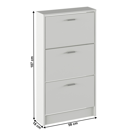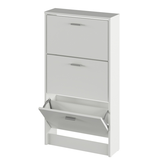 3-řadý botník MOBI 13 Materiál: DTD laminovaná Barva: bílá Rozměry (ŠxHxV): 58x18x107 cm Tloušťka materiálu: 1 - 1,6 cm 3-řadý Výklopné šuplíky Praktický Dodáváno v demontu