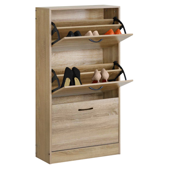 Materiál: dřevotříska/plast Barva: dub Rozměry (ŠxHxV): 60x24x116 cm Tloušťka materiálu: 1,2-1,5 cm Tři výklopné šuplíky Šuplík rozdělený na 2 části Výška spodního prostoru od podlahy: 9 cm Rozměry výklopného šuplíku (ŠxV): 56,4x34,5 cm Nosnost výklopného šuplíku: 6 kg Nosnost vrchní desky: 10 kg Moderní design Praktický Dodáváno v demontu