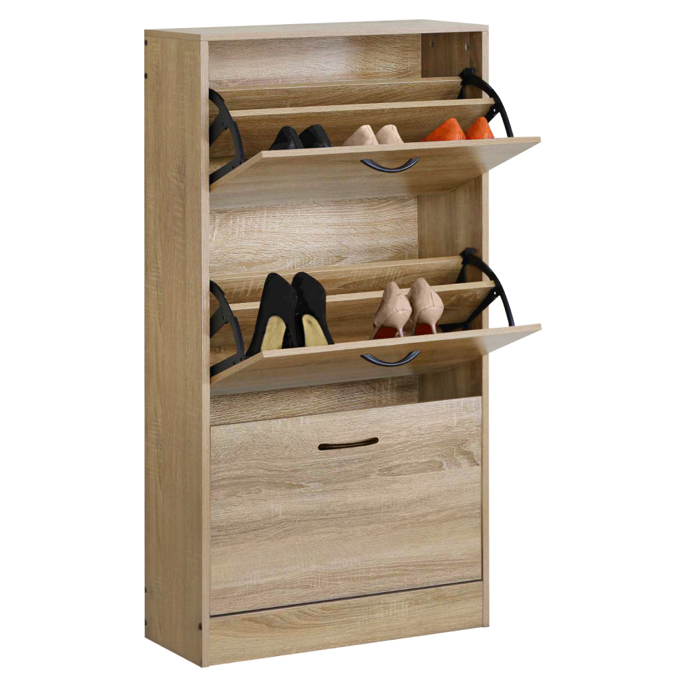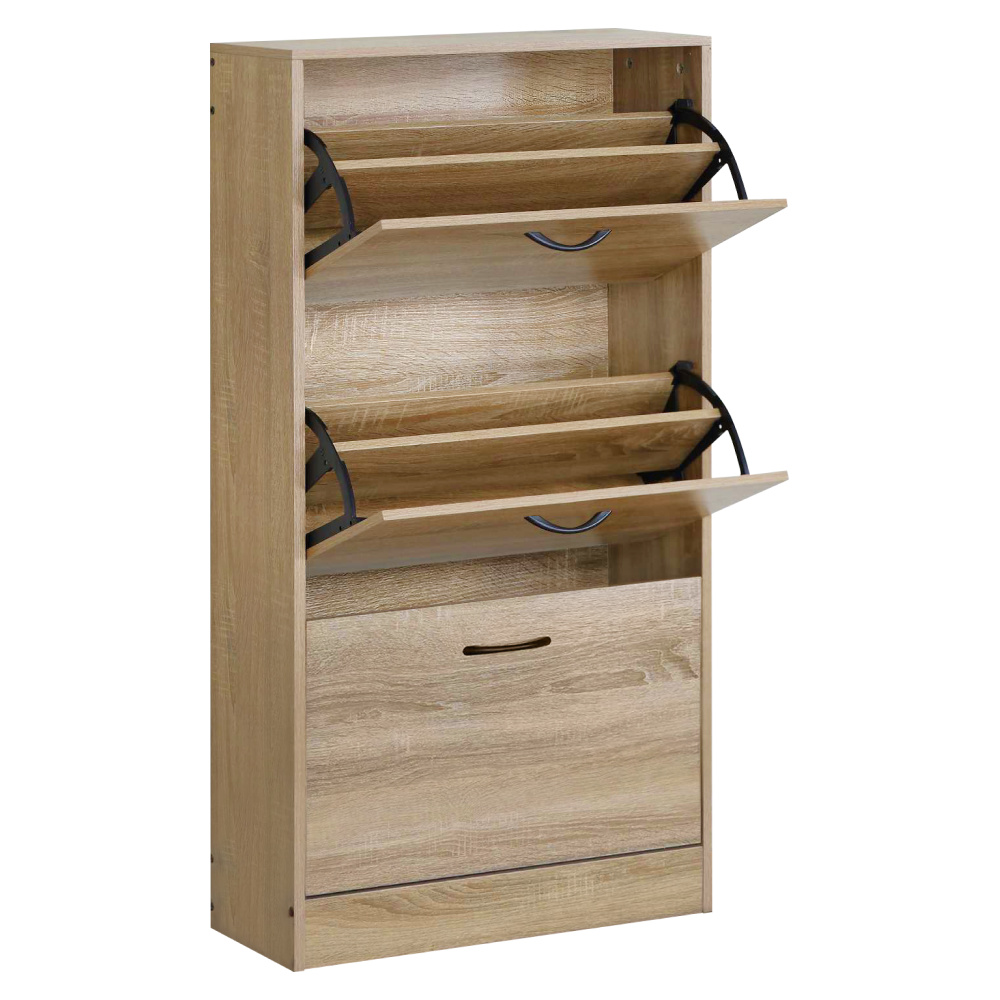 Materiál: dřevotříska/plast Barva: dub Rozměry (ŠxHxV): 60x24x116 cm Tloušťka materiálu: 1,2-1,5 cm Tři výklopné šuplíky Šuplík rozdělený na 2 části Výška spodního prostoru od podlahy: 9 cm Rozměry výklopného šuplíku (ŠxV): 56,4x34,5 cm Nosnost výklopného šuplíku: 6 kg Nosnost vrchní desky: 10 kg Moderní design Praktický Dodáváno v demontu