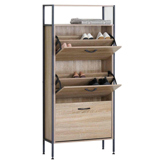 Materiál: dřevotříska/ocel/plast Barva: dub/černá Rozměry (ŠxHxV): 63x24x141 cm Tloušťka materiálu: 1,2-1,5 cm Výška spodního prostoru od podlahy: 13,5 cm Na nožičkách Tři výklopné šuplíky Šuplík rozdělený na 2 části Prostor mezi šulíky: 9 cm Rozměry výklopného šuplíku (ŠxV): 56,4x34,5 cm Nosnost výklopného šuplíku: 6 kg Police Nosnost vrchní desky: 10 kg Moderní design Praktický Dodáváno v demontu
