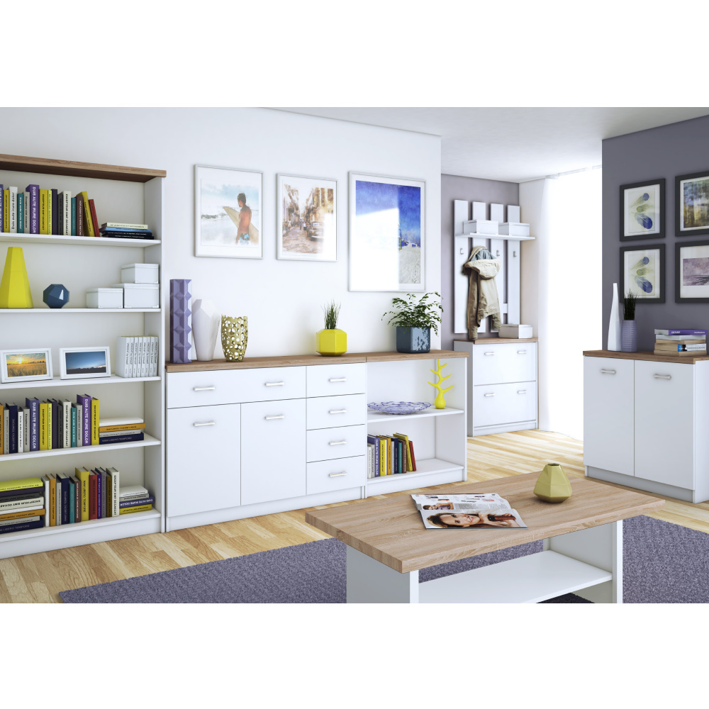 regál otevřený Materiál: DTD laminovaná Provedení: bílá / dub sonoma Rozměry (ŠxHxV): 80x33x183 cm Tloušťka materiálu korpus: 16 mm Tloušťka materiálu vrchní desky: 32 mm Moderní sektorový systém vhodný na zařízení kanceláří, pracoven, obývacích prostorů či předsíní Hmotnost: 28.8kg